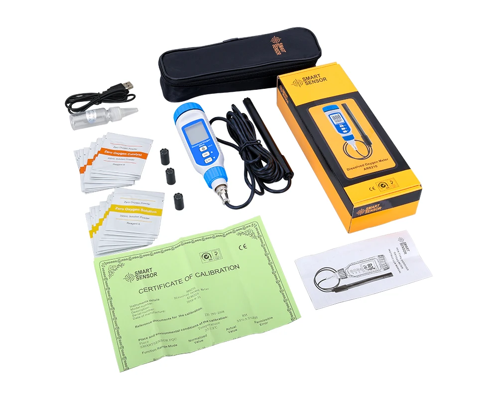 1 шт. * Измеритель Растворенного Кислорода1 шт. * USB кабель10 шт. * реагент типа A10 шт. * B реагент типа3 шт. * защитный чехол1 шт. * Руководство пользователя1 шт. * сертификат калибровки