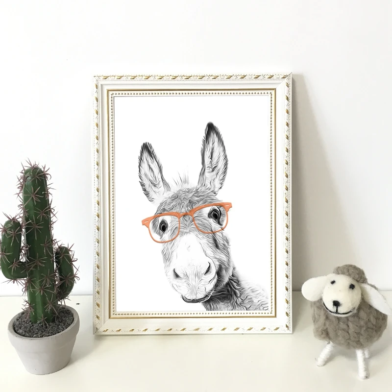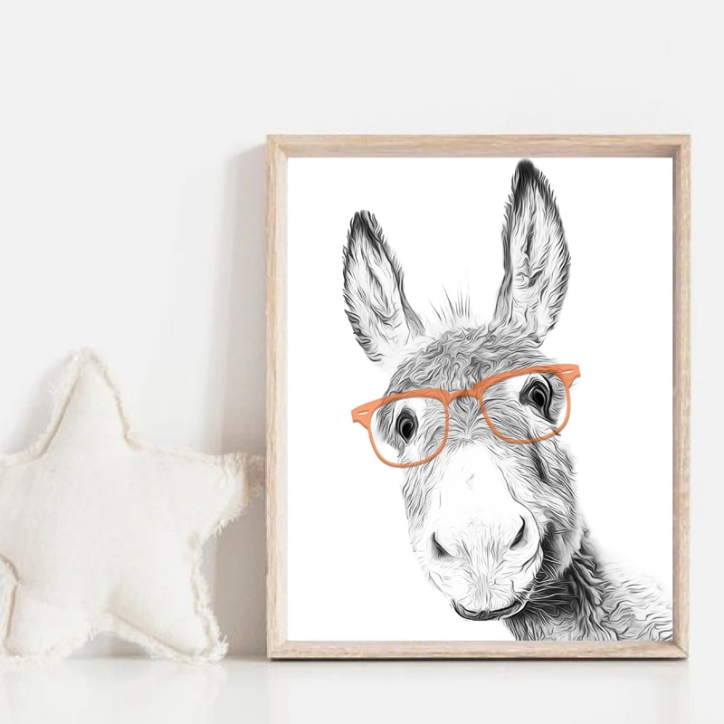 Художественный постер на холсте с изображением фермы осла, детская комната, Настенный декор, осел с очками, черная белая картина на стену