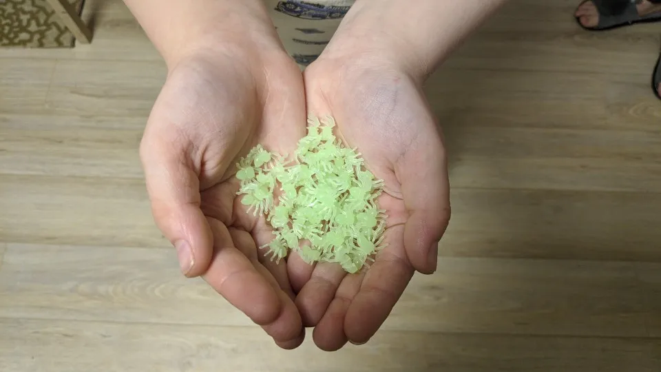 Целая горсть паучков. И все светятся в темноте. Ребенку весело...