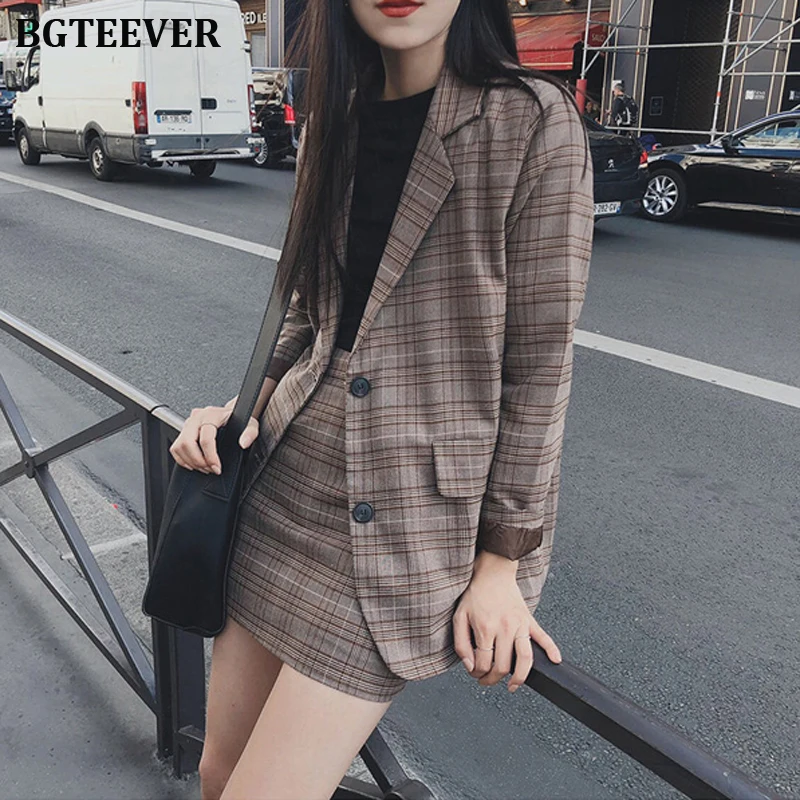 Женский блейзер, клетчатый блейзер в стиле ретро, однобортный пиджак и юбка, офисный костюм из 2 предметов, 2019