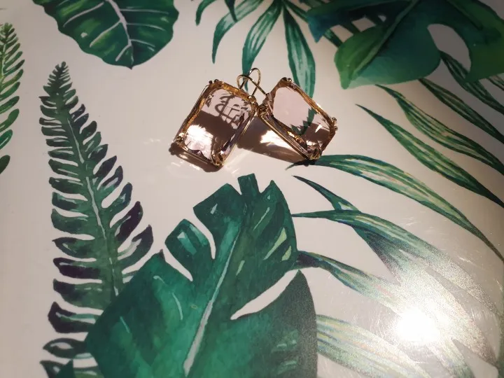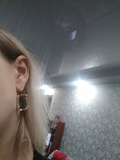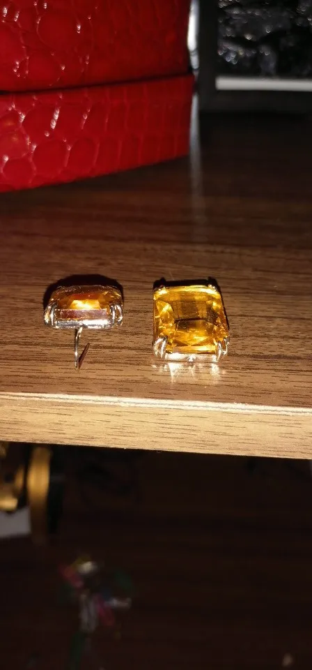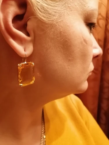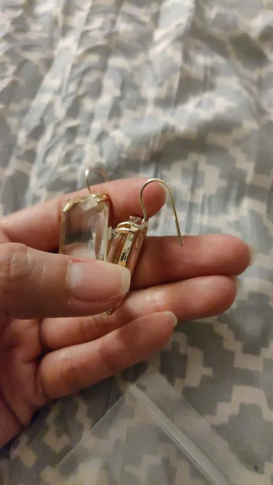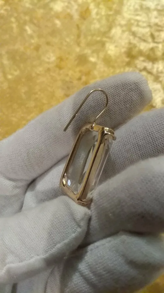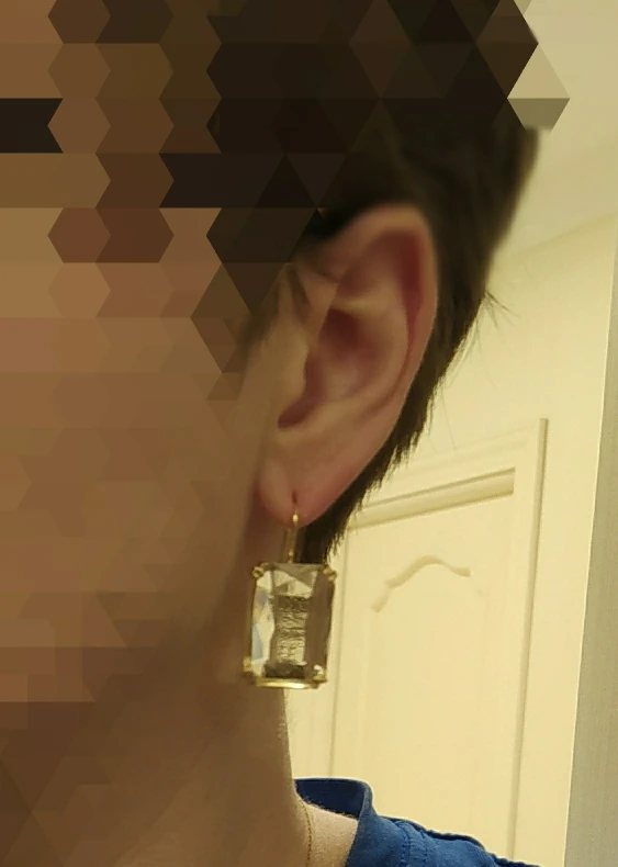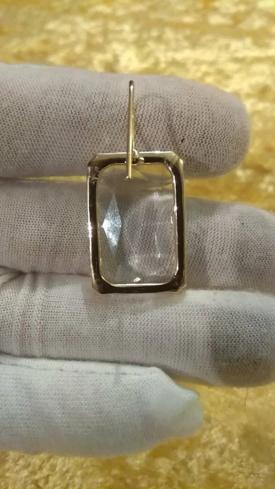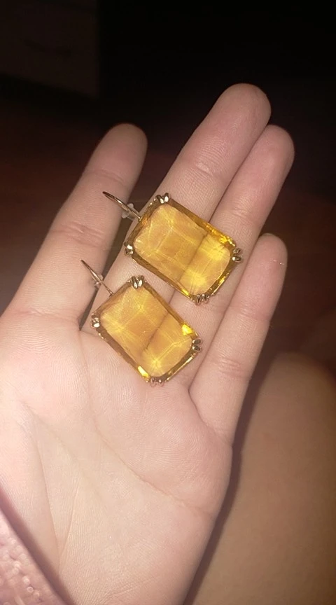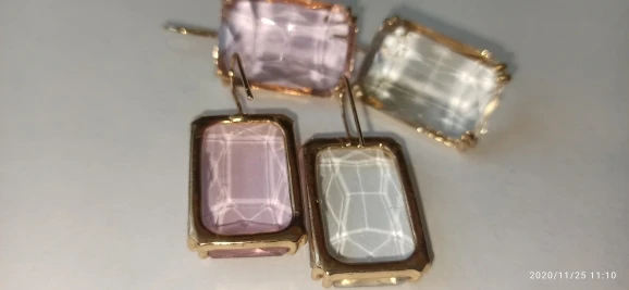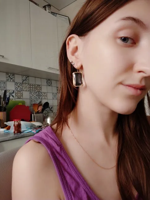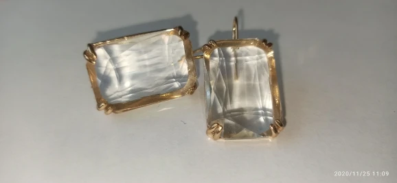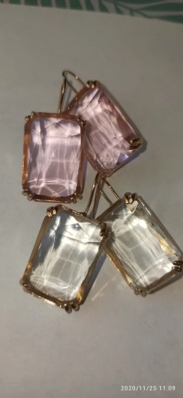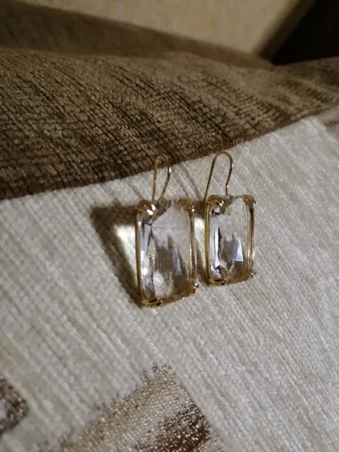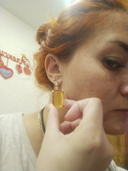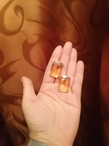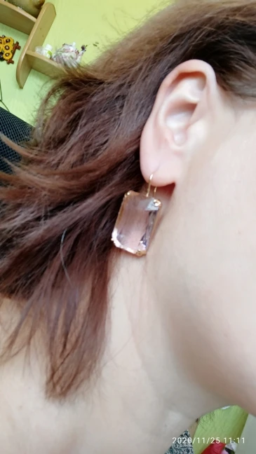 Доставка быстрая, на фото цвет не очень. В реальности жёлтый металл. По весу судя, стекло. На солнце хорошо играют. Металл не гигиенический. Я не могу носить дольше пары часов. И кончики застёжки очень острые - царапают ухо при надевании. Но в целом, за такую цену ок.