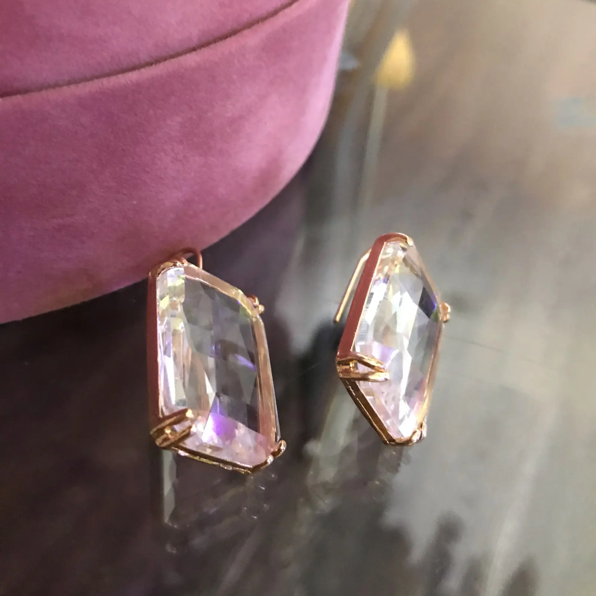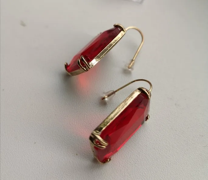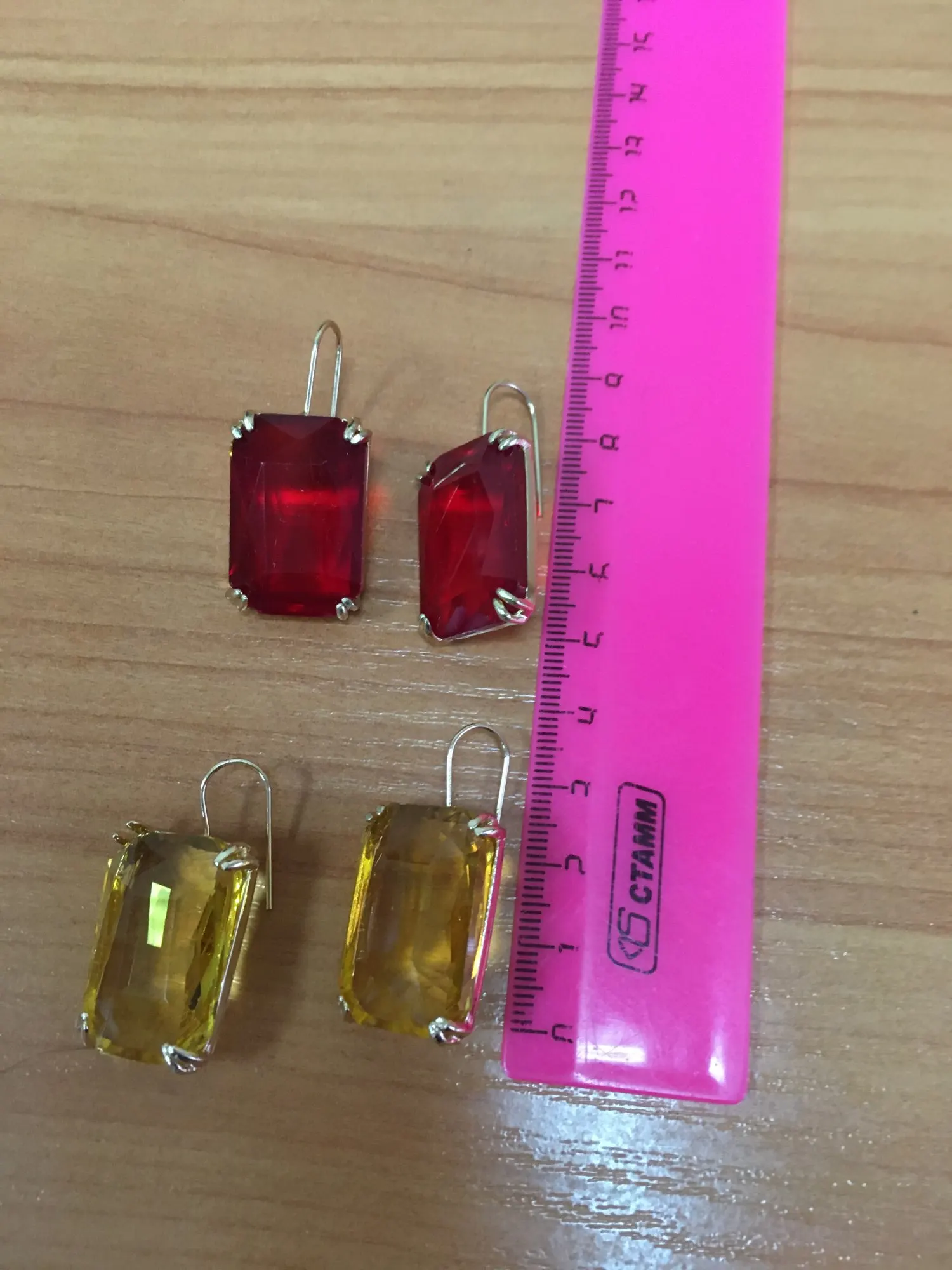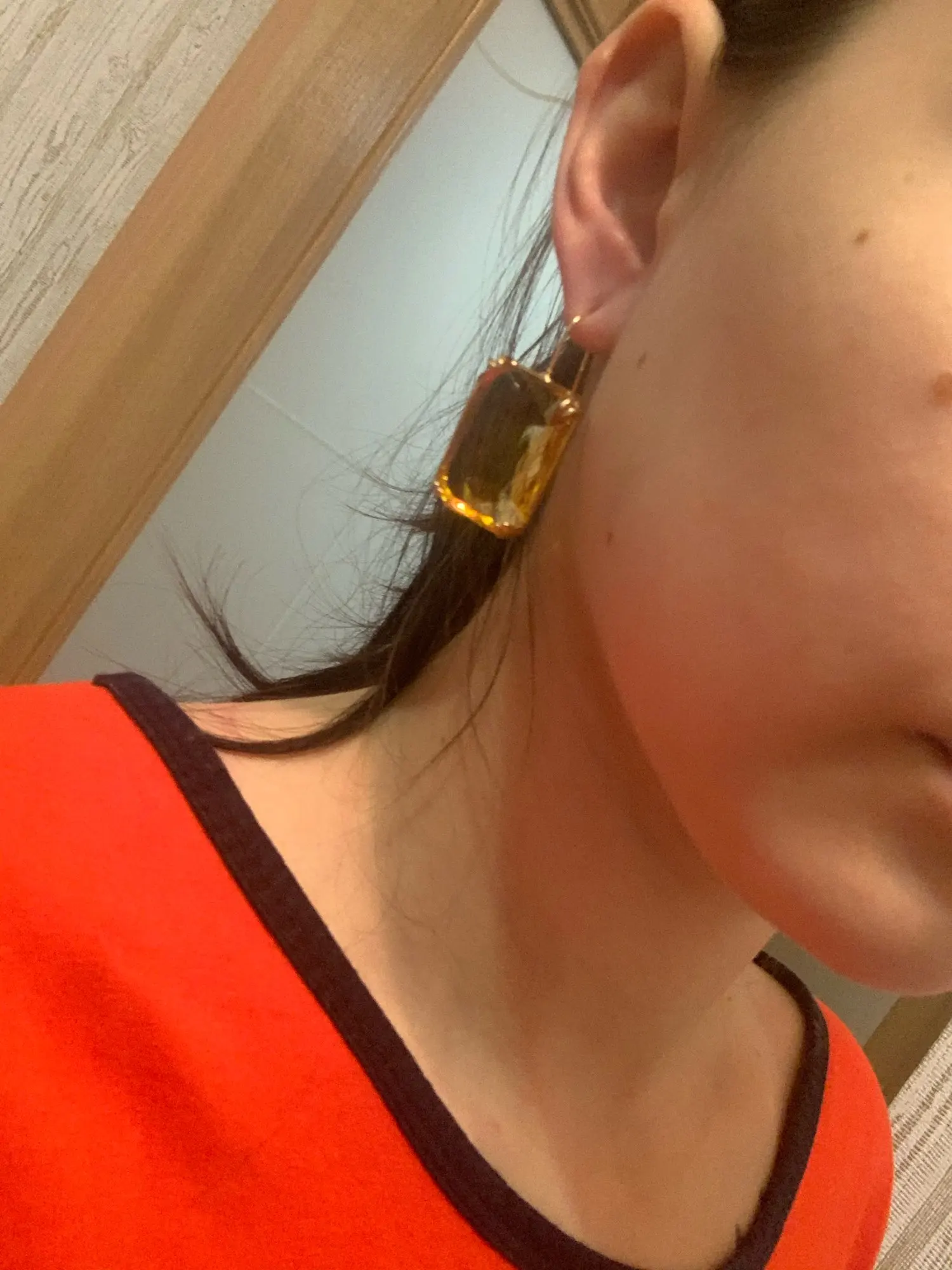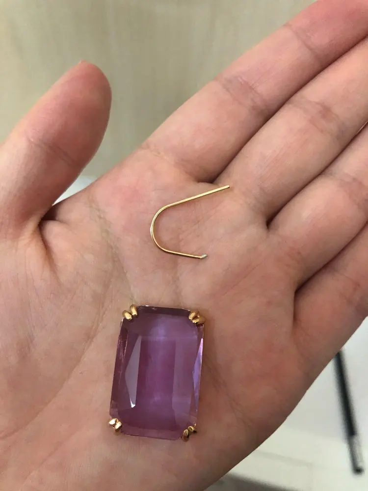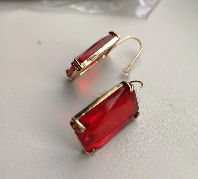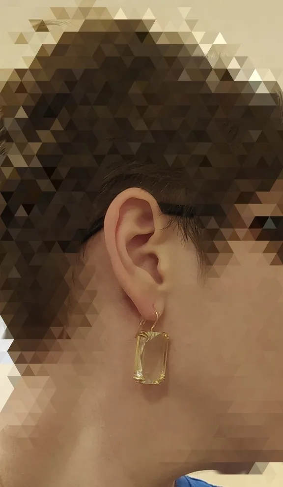 Доставка быстрая, на фото цвет не очень. В реальности жёлтый металл. По весу судя, стекло. На солнце хорошо играют. Металл не гигиенический. Я не могу носить дольше пары часов. И кончики застёжки очень острые - царапают ухо при надевании. Но в целом, за такую цену ок.
