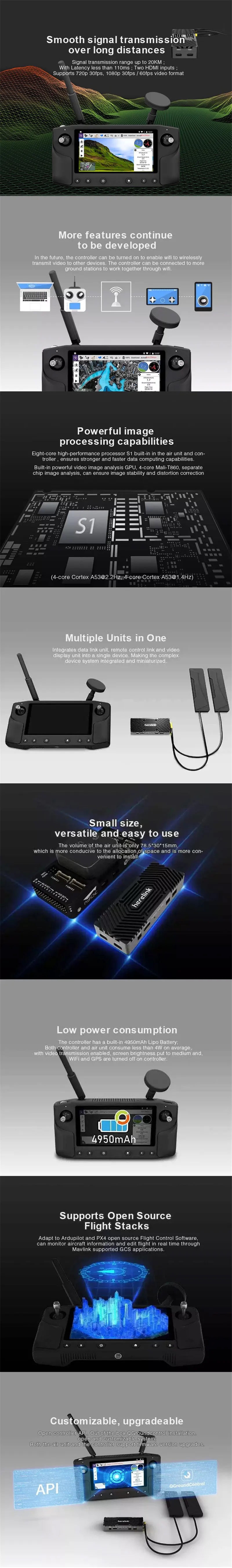 Воздушный блок использует входную мощность 5-12 В и имеет один UART для подключения к полетному контроллеру или другим аксессуарам Mavlink. Так воздуха вращающегося вала и радиоконтроллера оснащены мощными шишка S1 процессоры с 4 ядра по 2,2 ГГц и 4 больше дополнительной информации о ядра по 1,4 ГГц. Это обеспечивает множество возможностей для использования приложений и будущего развития.