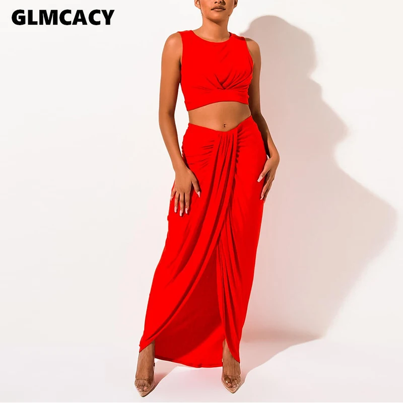 Женский костюм из двух предметов: укороченный топ без рукавов и юбка макси с разрезом