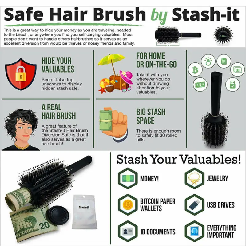 Тайно скрывайте свои драгоценности, используя тайникЩетка для волос безопасная для утечки. Всегда хорошо иметь специальный Сейф для ваших вещей, которые вы хотите хранить дома, или в дороге! Эта кисть выглядит как настоящая щетка для волос. Вы можете легко переносить его в автомобиле, сумке или кошельке, не вызывая подозрений и не оповещая воров о ваших ценных товарах.