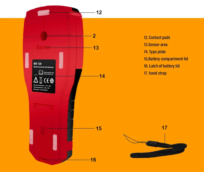 1. Кольцо подсветки 2. Отверстие для маркировки 3. Кнопка маркировки 4. Дисплей 5. Индикация операционной модели 6. Кнопка ВКЛ/ВЫКЛ 7. Кнопка подсветки дисплея 8. Индикация зуммера 9. Модель заряженного провода 10. Металлическая Модель 11. Многофункциональный детектор стены модель 12. Контактные колодки 13. Площадь датчика 14. Тип пластины 15. Крышка батарейного отсека 16. Защелка крышки батареи 17. Крепление ручного ремня 18. Ремешок на руку