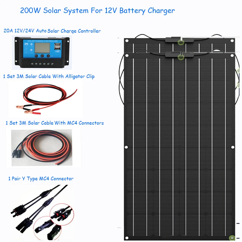 ETFE Гибкая солнечная панель 100 Вт,2 штуки; Размер: 1050 мм * 540 мм * 2,5 мм. 20A, 12В/24В авто ЖК ШИМ Солнечный контроллер заряда; 1 шт. Y Тип Солнечного кабеля; Женский и мужской; 1 комплект; 3 м Удлинительный Солнечный Кабель; Красный и черный; 1 комплект; 3 м Солнечный Кабель с зажимом аллигатора; 1 комплект