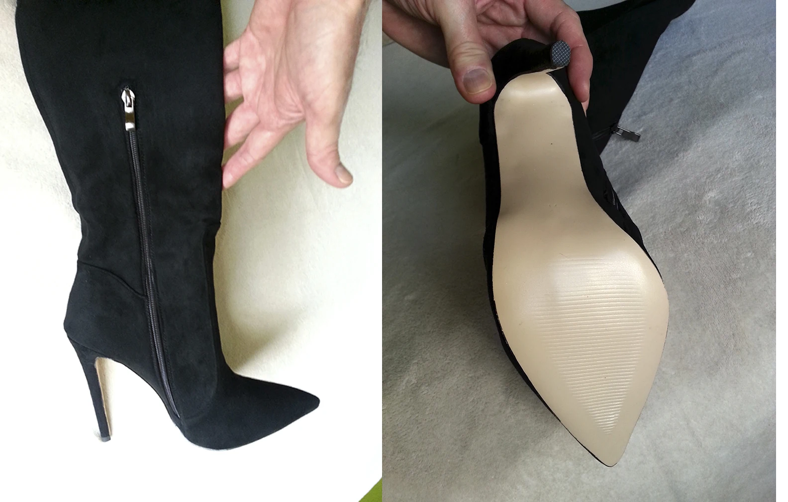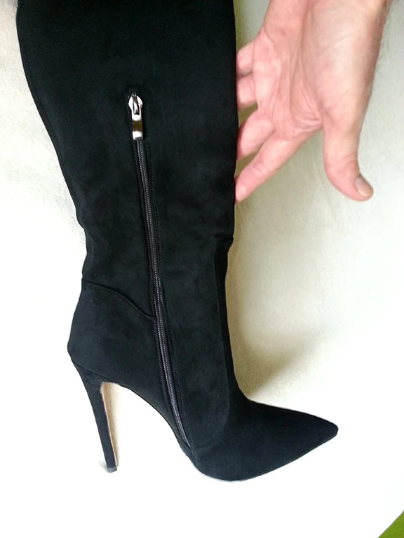 Очень красивые ботинки и потрясающее качество! Я разместил несколько фотографий, чтобы показать детали ботинок. Внешняя ткань ботинок выглядит очень близко к настоящей замше, отличное качество. Обувь имеет бархатную подкладку и короткую застежку-молнию внутри ботинка. Одна вещь, которую я хочу отметить, это высота голенища, она примерно на 2 дюйма выше, чем обычные сапоги до колена, эти сапоги, скорее всего, окажутся в середине колена, а не под коленом. Высокий каблук 4,75 дюйма и очень тонкий. Эти ботинки очень красивые и стоят каждого цента, за который я заплатил!