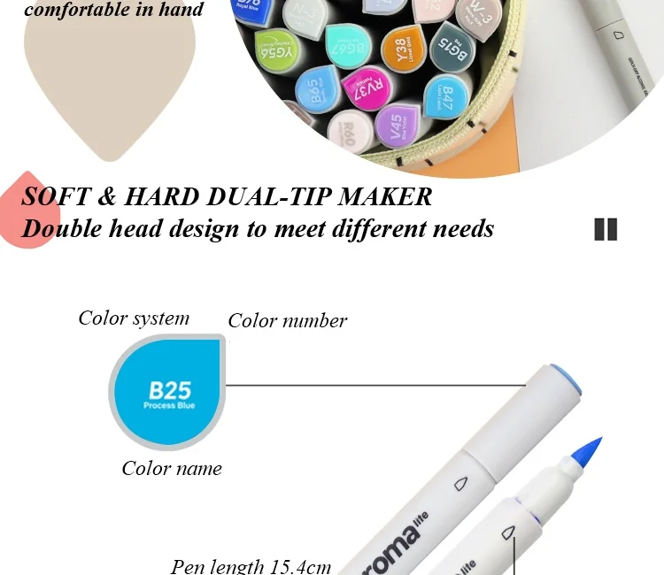 Маркеры шикарные, очень удобная кисть. Она упругая и тонкая в конце, очень удобно красить мелкие детали. На ощупь приятные, в руке держать приятно, были упакованы в сумочку и пупырку. Буду ещё такие заказывать. Было бы намного удобнее с выбором цвета самому, но продавец написал , что не поддерживает штучную продажу. Заказ шел в новогодние праздники, нигде не задержался. Доставка самолётами и в екб уже курьерской службой ЕМС. На удивление ЕМС сработали молниеносно, курьер позвонил на второй день и принес товар. Спасибо большое продавцу, ещё буду заказывать)