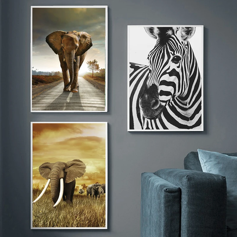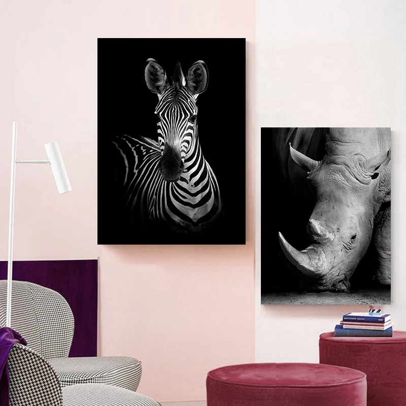 Живопись на холсте с изображением слона зебры льва жирафа носорога черного и белого цветов, постер с рисунком на стену в скандинавском стиле