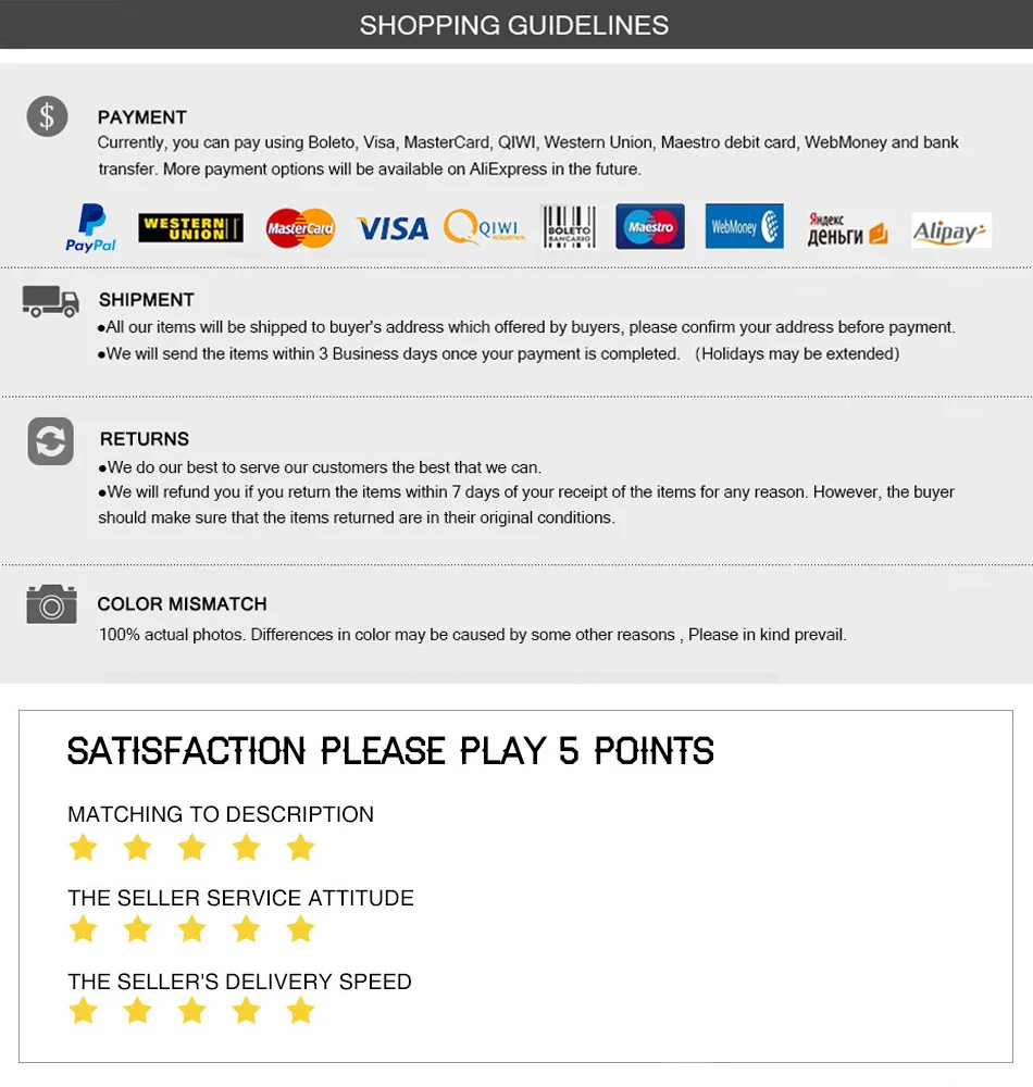 PaymentDear друг, вы можете оплатить деньги: Кредитная карта/webmoney transfer/дебетовые карты/western union/QIWI Wallet, если вы не знаете, как оплатить деньги, пожалуйста, смотрите эту ссылку: http://help.aliexpress.com/payment_method.html Поставка details1. Авиапочта (15-90 дней доставки) (Бесплатная доставка + номер отслеживания) 2. EMS (10-25 дней доставки с номером отслеживания, требуется дополнительная стоимость доставки) 3. DHL (Доставка 5-10 дней с номером отслеживания, требуется дополнительная стоимость доставки) Также можно воспользоваться услугами UPS, Fedex и TNT! Свяжитесь с нами 1. Мы не несем ответственности за любые таможенные пошлины или налог на импорт. 2. Пожалуйста, свяжитесь с нами, прежде чем оставлять положительные отзывы. 3. Спасибо, что дали нам шанс сделать все правильно путем хорошего общения. 4. После покупки, пожалуйста, не оставляйте отрицательные или нейтральные отзывы, если вы не получили товар в течение 90 дней, потому что мы неоднократно указывали время доставки. 5. На все электронные письма будет дан ответ в течение 1 рабочего дня. Если вы не получили от нас ответа, пожалуйста, отправьте электронное сообщение повторно, и мы ответим вам в кратчайшие сроки. Возврат товара 1. Товары будут заменены или возвращены при возврате. 2. Покупатель несет ответственность за все расходы по доставке и страховку. 3. Дефектные товары должны быть замечены в течение 7 дней с даты получения. После того, как я получил посылка, вернем Вам деньги как можно скорее.