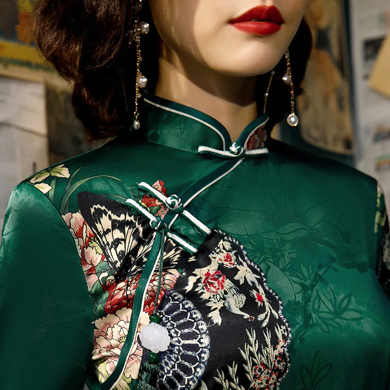 Зеленое традиционное китайское платье-Ципао с цветочной вышивкой, ш...