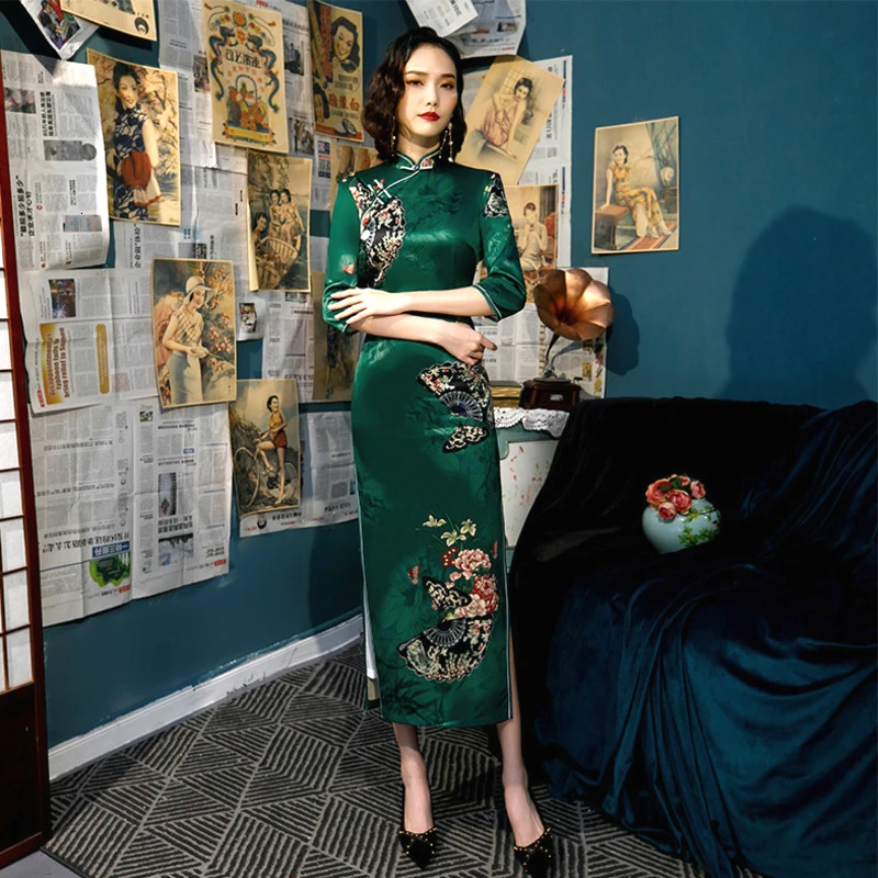 Китайское платье Ципао, длинное шелковое элегантное традиционное пл...