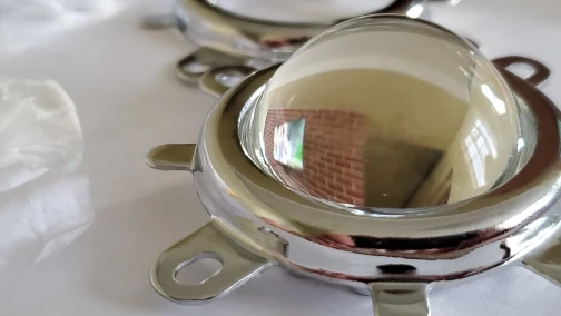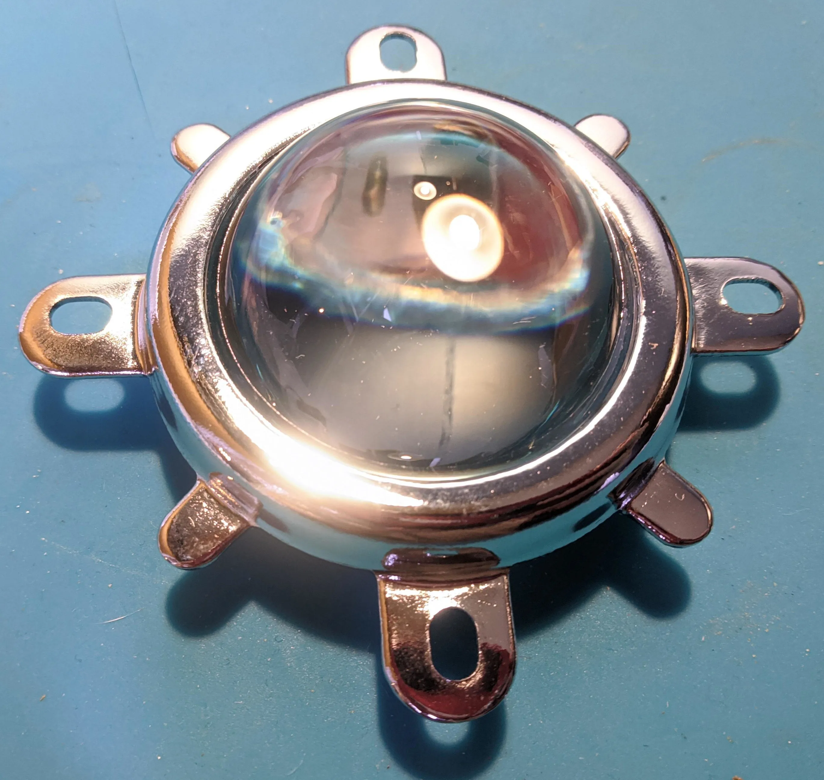 Подошла для 100Вт светодиода. Линза не царапанная, действительно собирает луч +/- 60 градусов.
