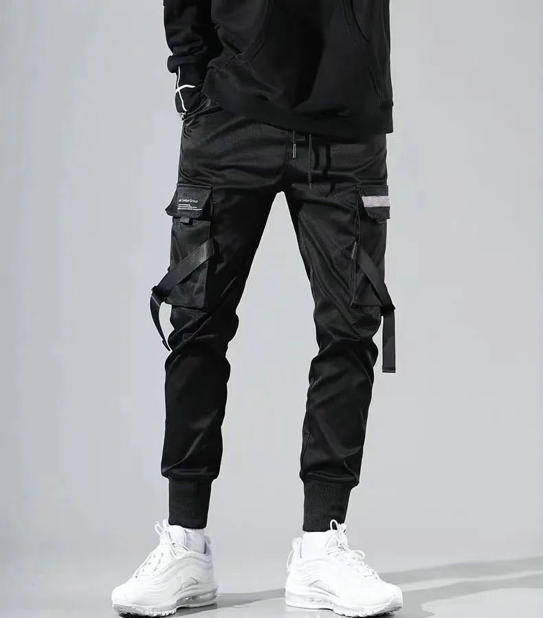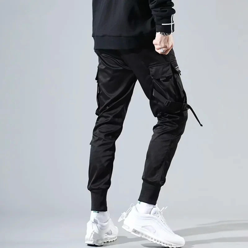 Брюки-карго мужские с лентами, черные джоггеры-султанки с множеством карманов, спортивные штаны в стиле Харадзюку, повседневные брюки-султанки в стиле хип-хоп