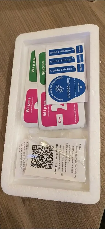 стекло чуть меньше размера чем экран. жижи в комплекте небыло. через неделю отклеился левый край