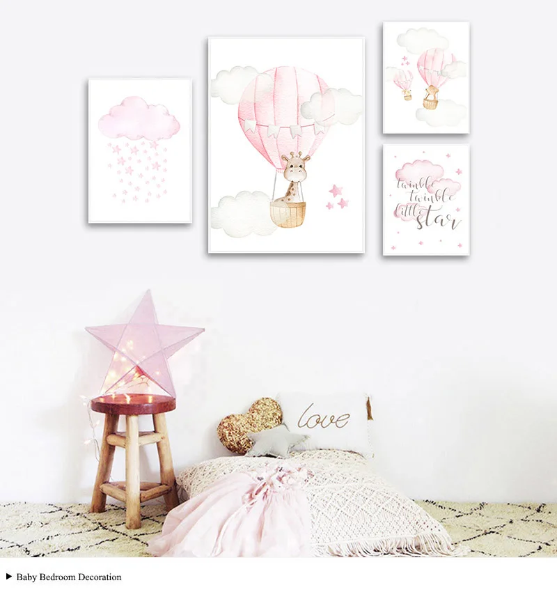 Детский Настенный холст для девочек, постер с розовым воздушным шаром, рисунок с животными для путешествий, Скандинавское украшение для детской спальни