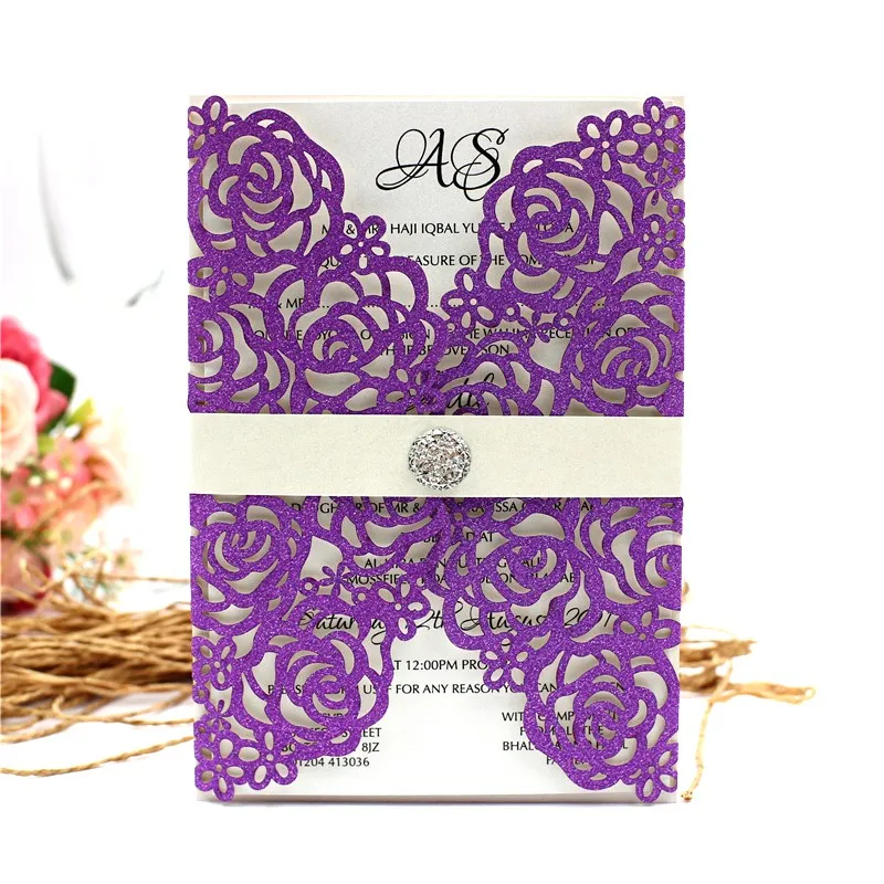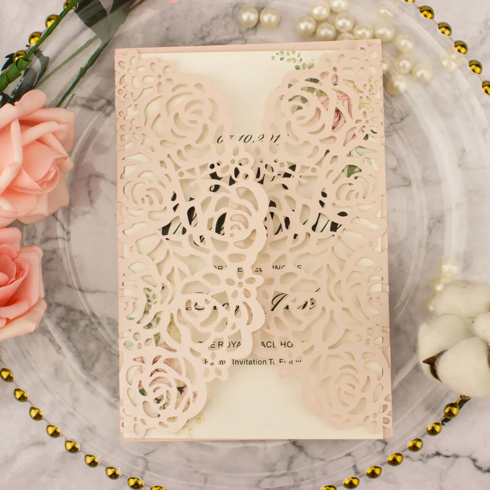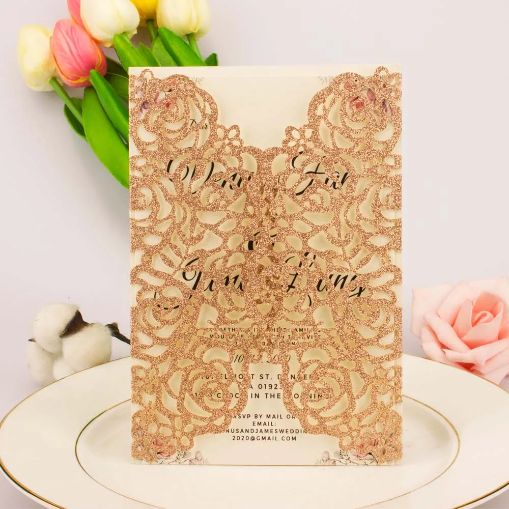 10 шт., розовое золото, свадебные пригласительные билеты, бордовые румяна, розовые, серебряные, блестящие, лазерная резка, карман, пригласительные карты для девичника