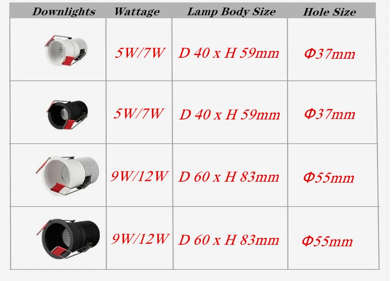 Вход Напряжение: AC85-265V/110V/220V 50/60Hz Мощность: 5 Вт, 7 Вт, 9 Вт, 12 Вт Регулировка яркости: Да Индекс цветопередачи (CRI):>Ra85 Угол луча: 24 ° Светодиодный чип: чип COB (Epistar) Световой поток: 95 ~ 110 лм/Вт Температура: от-25 до 45 ° Цветовая температура: теплый белый:(2700K-3000K); Натуральный белый:(4000K-4200K); Холодный белый:(6000K-6500K) Срок службы: 50000 ~ 80000 часов Гарантия: 3 года Материал: литье алюминия Происхождение: Гуандун (Китай)
