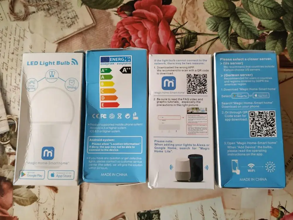 This was one of the slowest deliveries I have ever received. It took 72 days to arrive in Austria, from China. Even though it was in a bubble foil package, the light boxes were pretty smashed, but the bulbs were OK. There is absolutely nothing written on the bulb body. In order bulb to be connected to the wi-fi network, an application must be downloaded. The instructions are written on the box. The light bulbs doesn't look like a high quality product but I hope that they will last long. After downloading this app I will try to connect them to Alexa Echo.