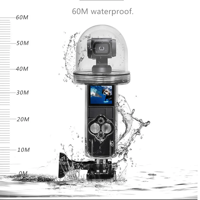 1,60 м водонепроницаемый. 2. Двойной дизайн интерфейса. Подходит для съемки под разными углами. 3. Высококачественное уплотнение. Водонепроницаемость более гарантирована. 4. Верхний силиконовый защитный рукав. Предотвращает попадание водонепроницаемого чехла в повседневную жизнь. 5. Кнопка из нержавеющей стали. Кнопки и винты изготовлены из нержавеющая сталь. Обладает антиоксидантным stodto предотвращает ржавчину. Длительный срок службы. Круглый купол на 6,360 градусов. Высокопрозрачный материал. Снимайте без мертвых концов. Водонепроницаемый оболочки: Материал: высокопрозрачный акрил и нержавеющая сталь 316 Вес: 90 г Водонепроницаемость: 60 м Размер: 60x60x165 мм