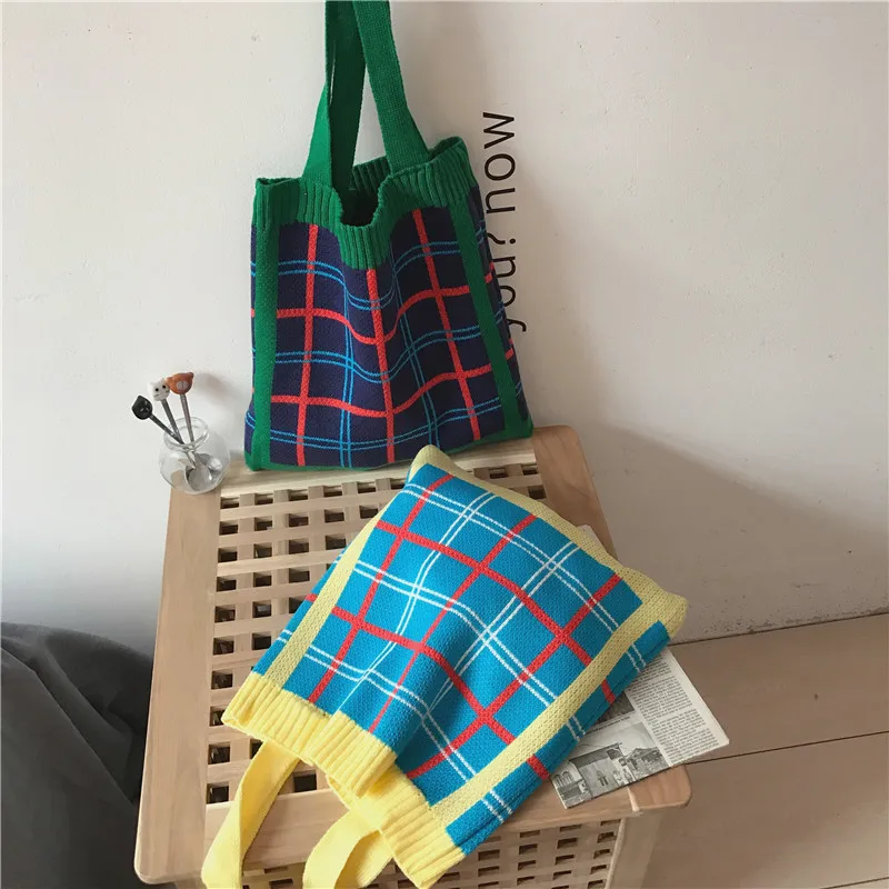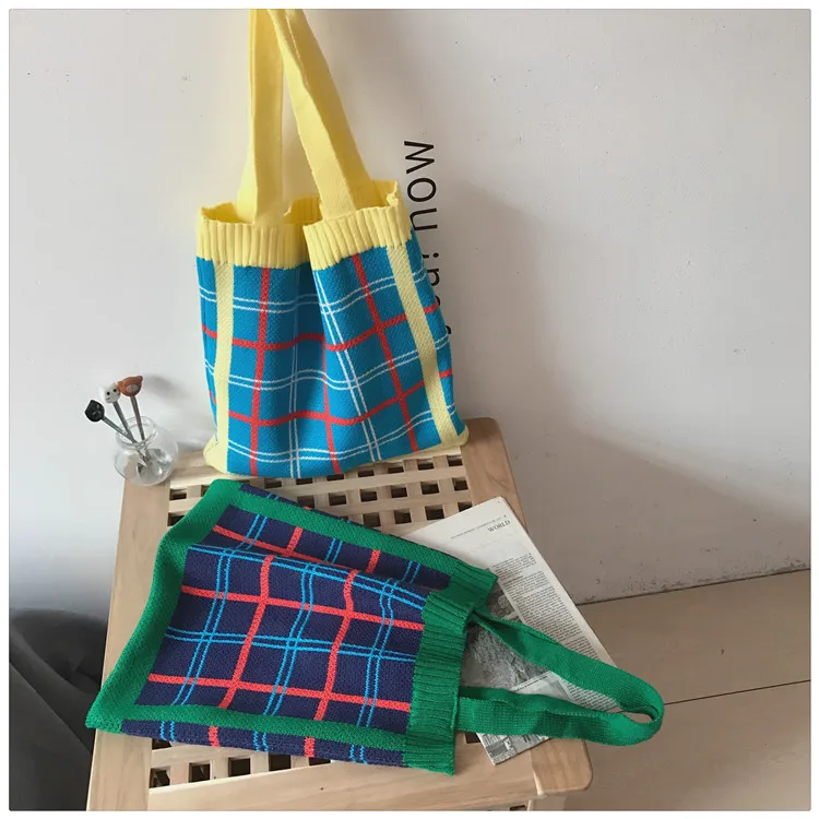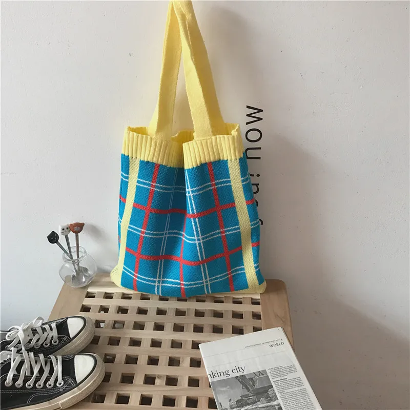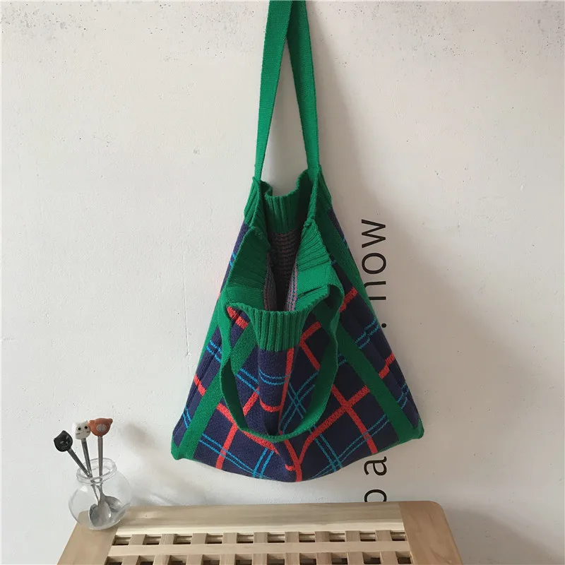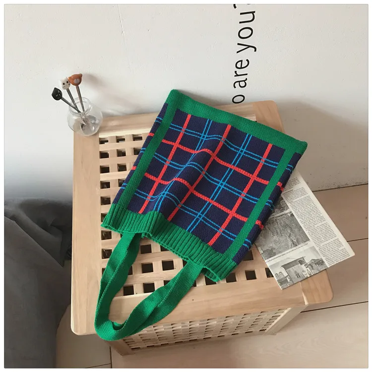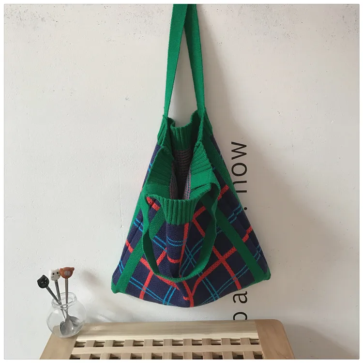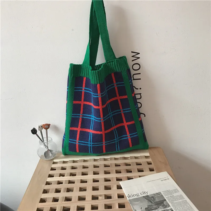 Модные женские шерстяные вязаные сумки для покупок, клетчатая Женская Большая вместительная сумка-тоут с цифрами, складная Повседневная сумка через плечо