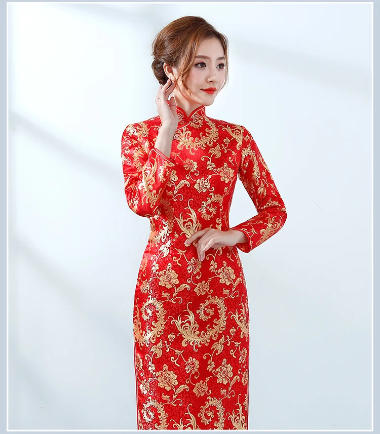 Красный китайский невесты свадебное платье сексуальное женское атлас с длинным рукавом повседневное вечернее вечерние изображениями драконов и феникса; Костюм с цветочным узором Qipao вечернее социальных Vestidos