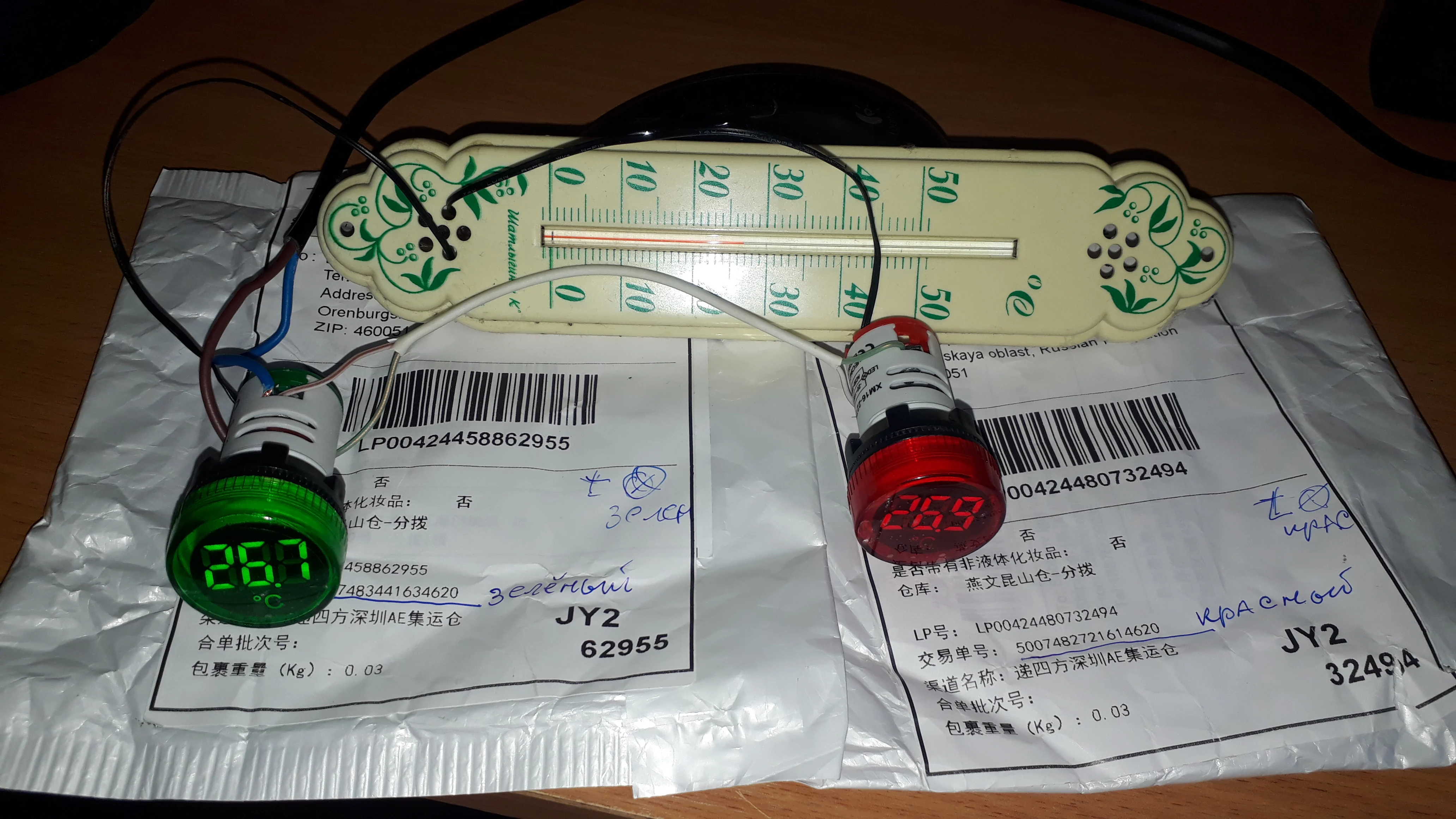 Брал один зеленый, по цене 96,89 руб. Прислали за 2 недели. Рабочая игрушка для гаража, индикатор включения сети потребителей и температура. Контактные зажимы корявые, хлипкие, но работают. Температура приблизительно совпадает с реальностью. Фото в сравнении с другим продавцом (красным). Бытовой термометр. Другое фото, температура пальцев в руке.