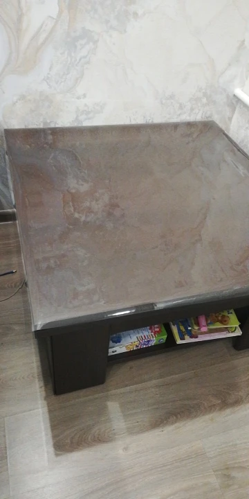 Доставили быстро, прямо до двери. Ложится на стол хорошо. Стелили на деревянную поверхность. После того, как все высохло - пузыри пропали. Рекомендую. Запах есть, но не сильный. Выветрился на балконе.