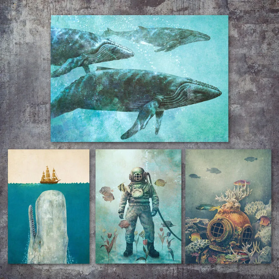 Парусник в море морского дна Diver КИТ Nordic Винтаж Плакаты и принты настенный художественный холст болит модульные картинки для Спальня без рамки