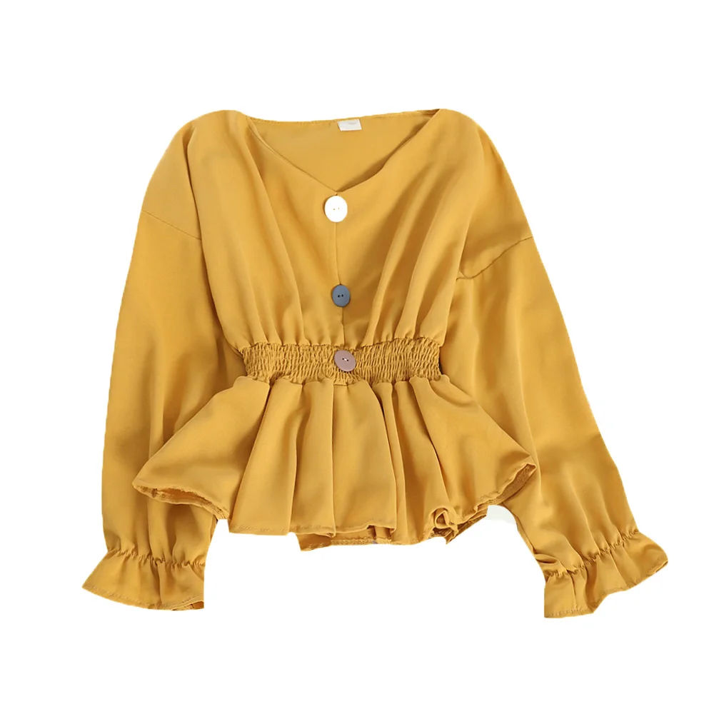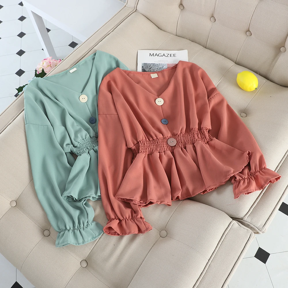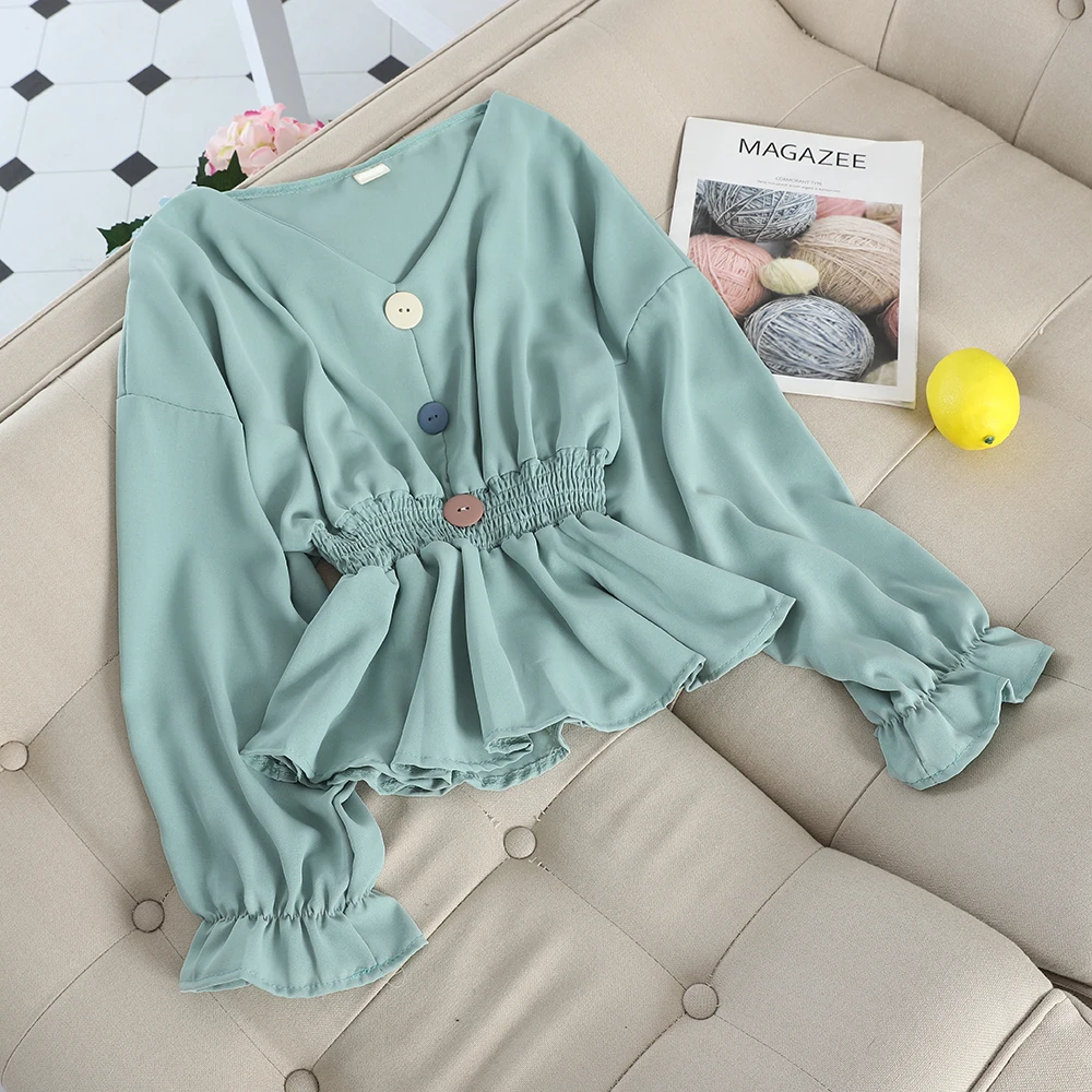 Элегантная женская шифоновая блузка с расклешенными рукавами, V-образным вырезом и оборками, винтажный эластичный облегающий кардиган на пуговицах, плиссированный пуловер