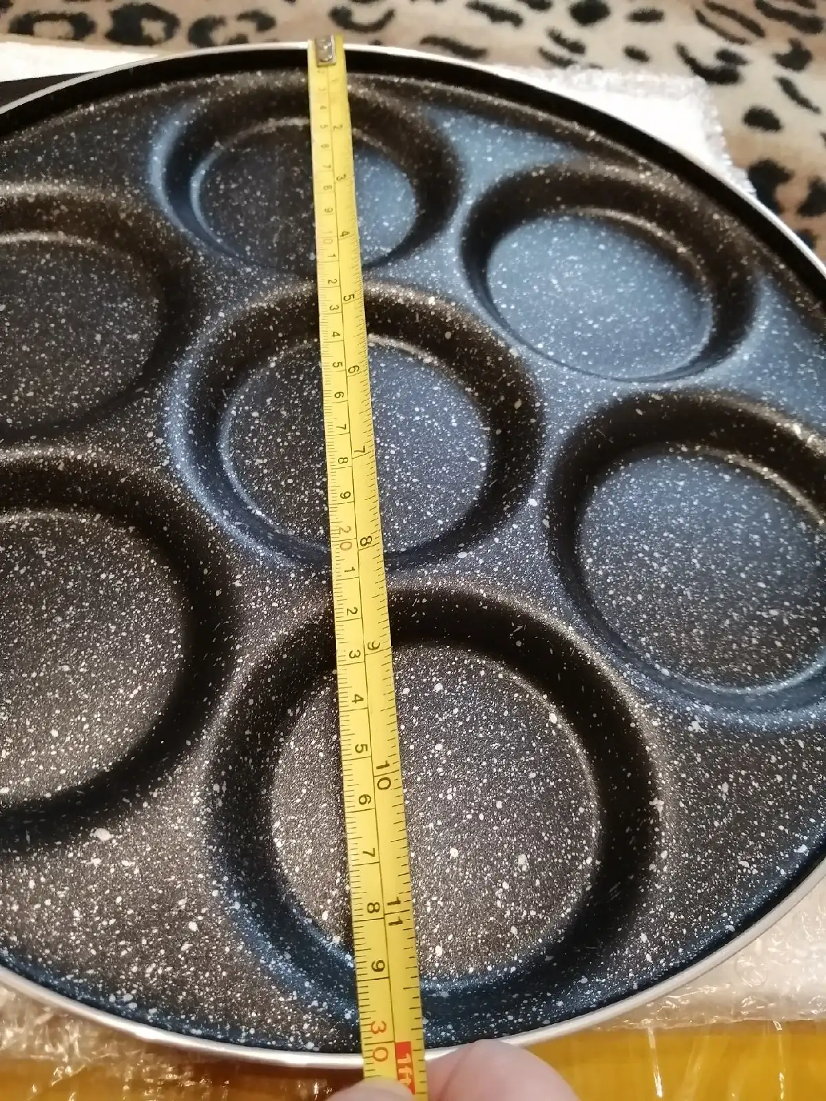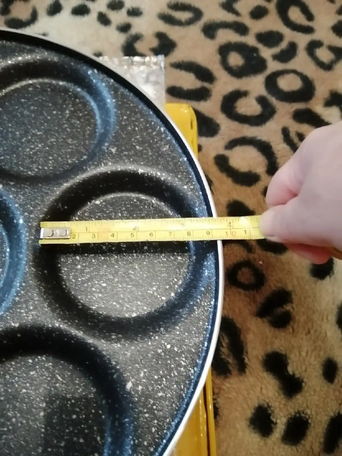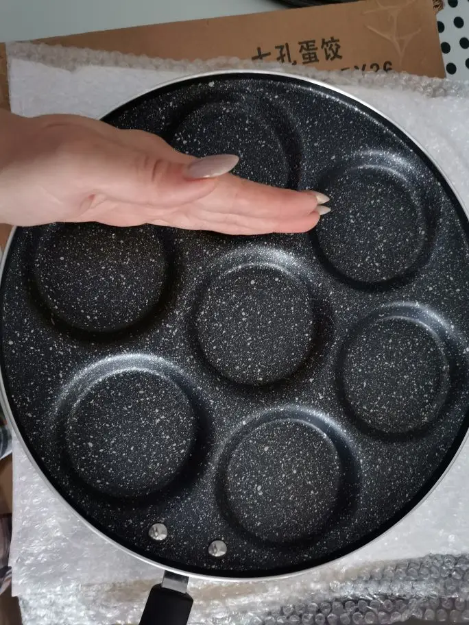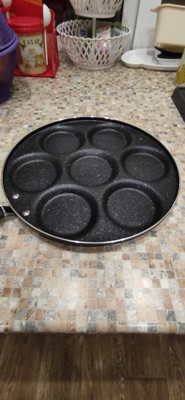 Опробовала, наконец, сковороду и пишу отзыв. Привезли на 5 день курьером. Сковорода реально большая. Диаметр чуть больше 30 см. Диаметр углублений примерно 7,5 см. Я боялась, что пропекаться будет неравномерно в центре и по краям. Все отлично. Сделала сегодня сырники. Получилось лучше, чем на обычной сковороде. Потому что в этих углублениях сырники запекаются не только снизу, но и с боков. Не расплываются. Я думаю, что и оладьи получатся замечательные. Всем рекомендую. Не сомневайтесь - сковорода отличная.