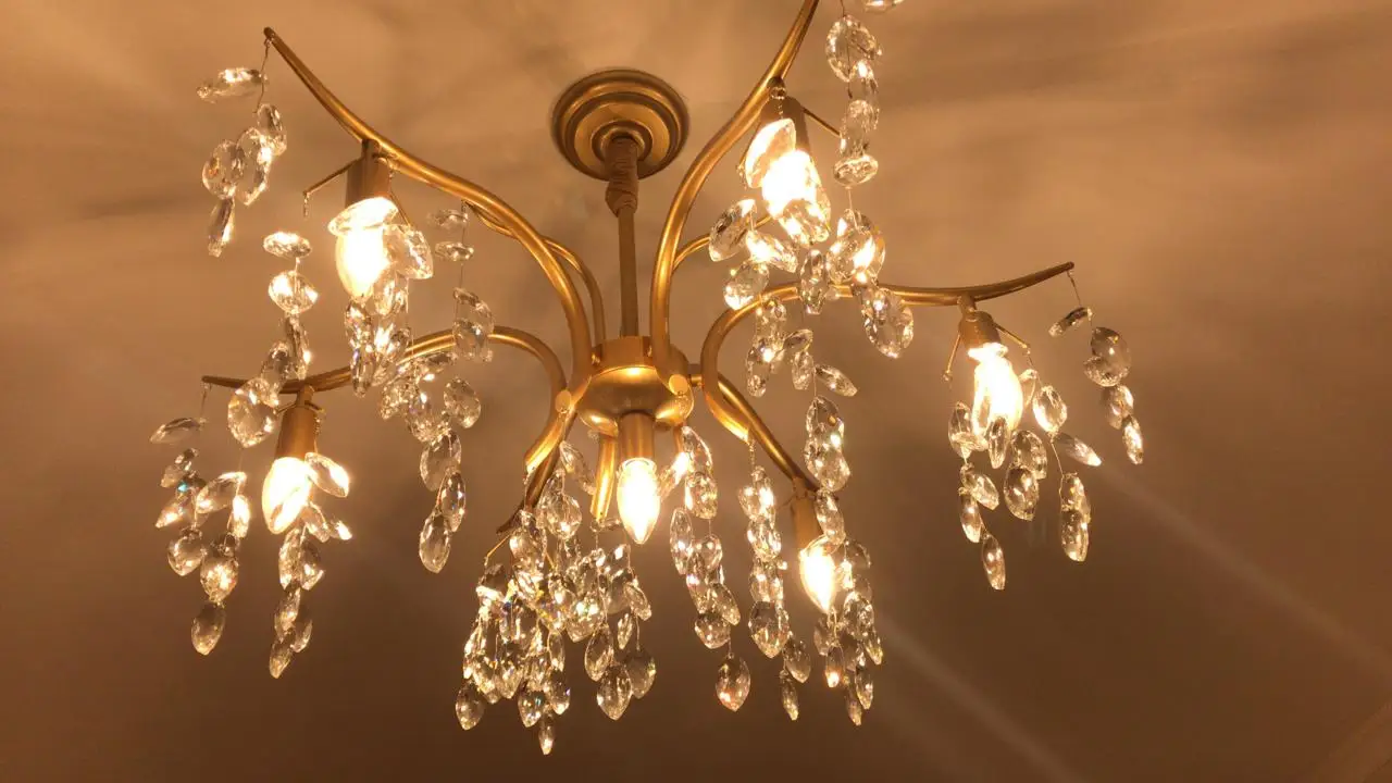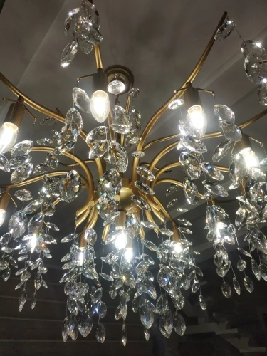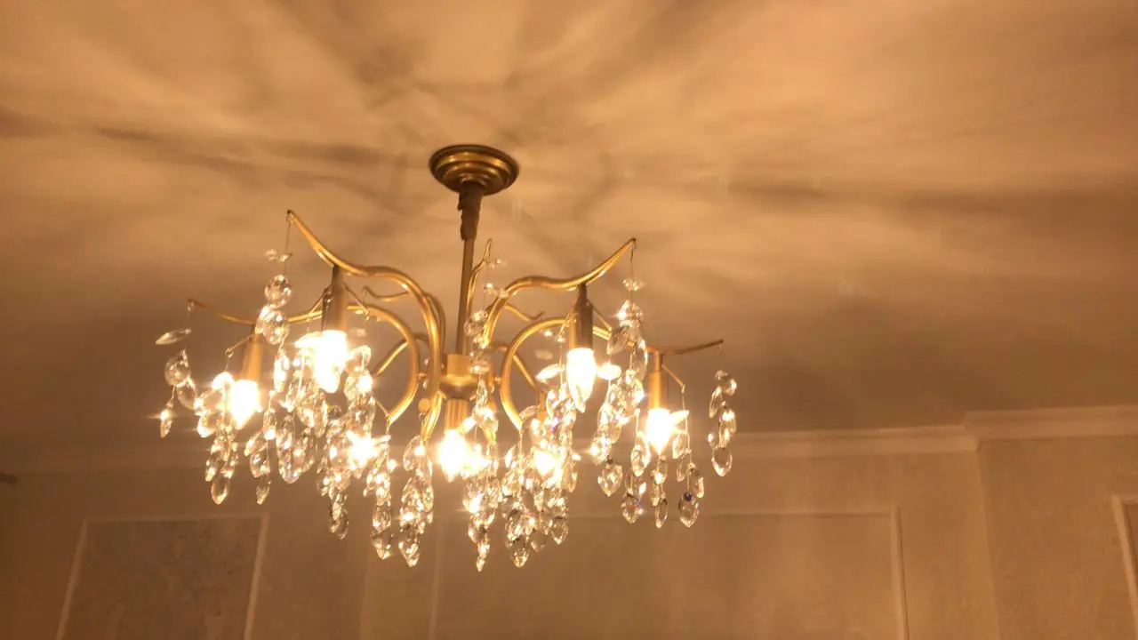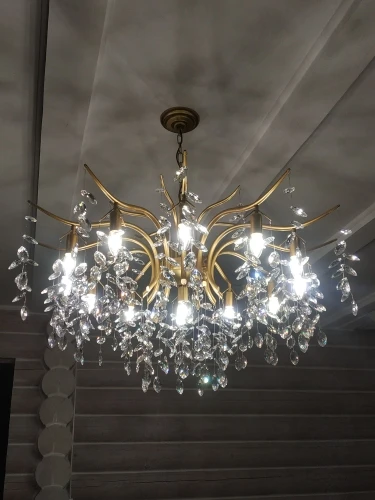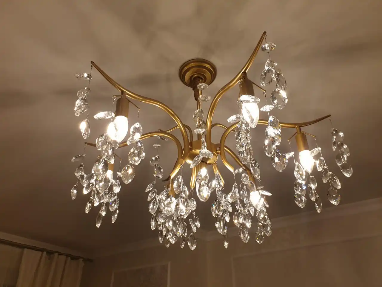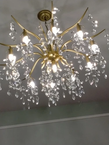 Металл на люстре покрыт краской, а не другим металлом под золото. Поэтому смотрится грубо и не соответствует другим светильникам в спальне. Это мой проах...