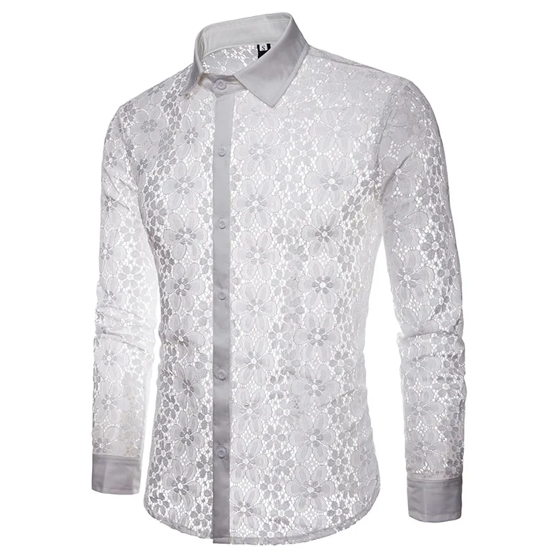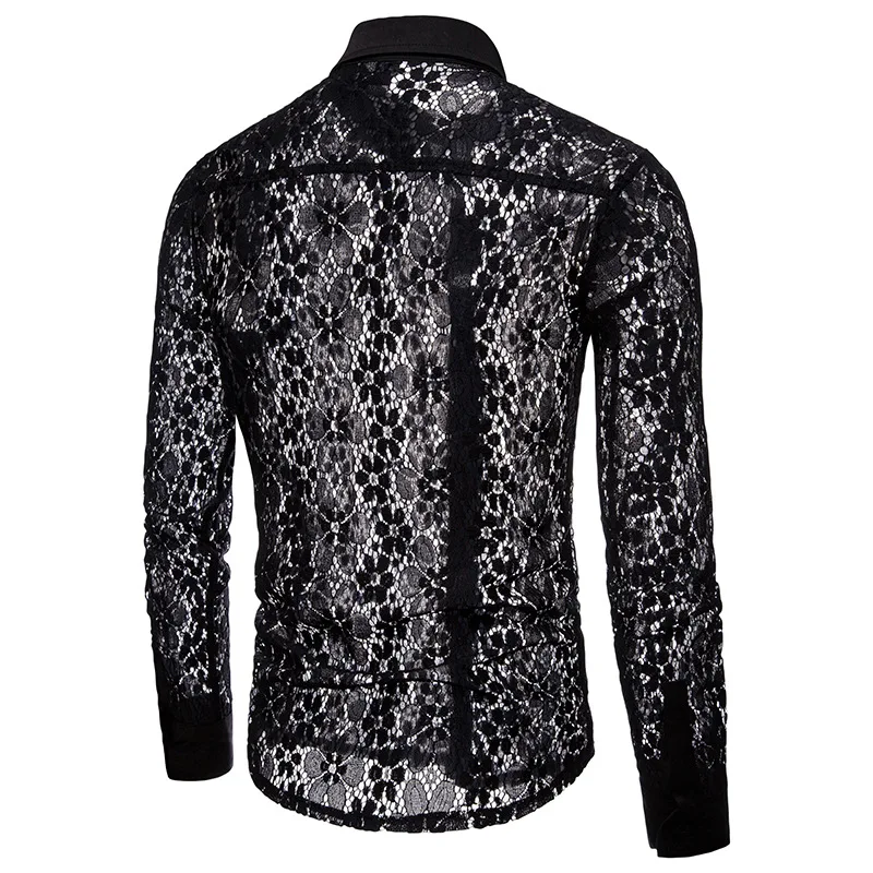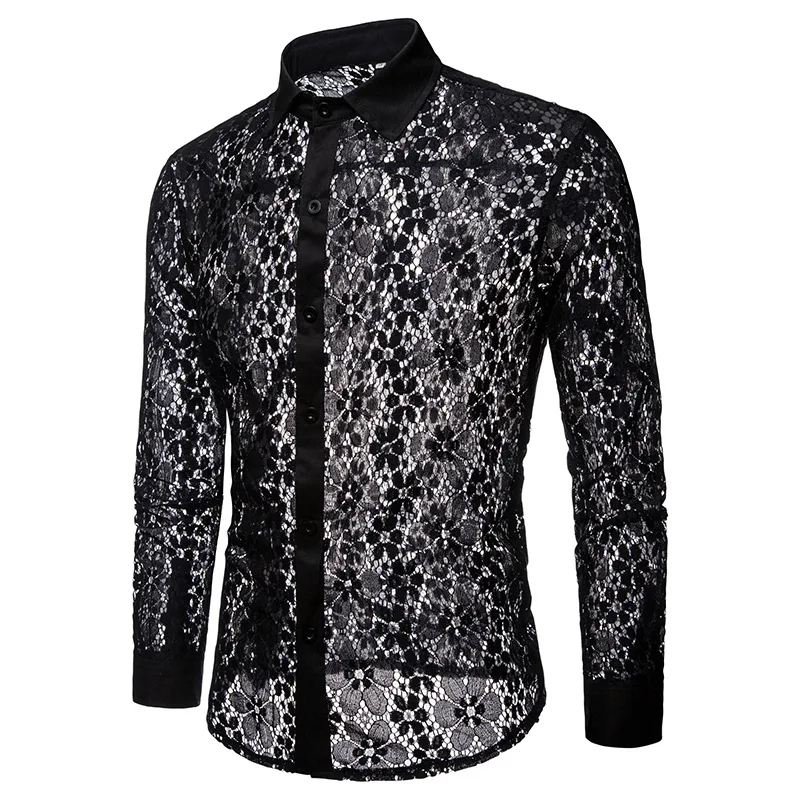 Мужские кружевные прозрачные майки, сексуальная сетчатая прозрачная рубашка для мужчин, облегающая, с длинным рукавом, для сцены, вечерние, для танцев, DJ, мужская одежда