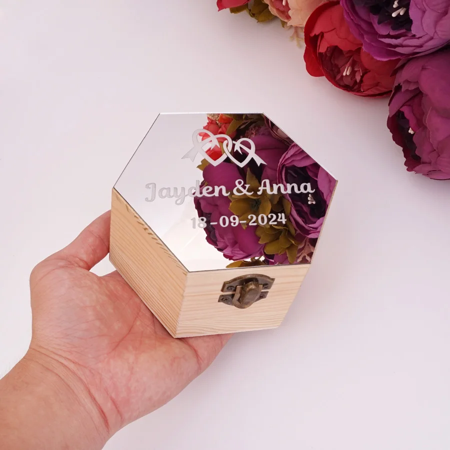 Шестигранник Форма акриловая зеркальная крышка коробка с сердечками пользовательское имя Дата вечерние подарок дерево Коробки роскошная коробка для конфет держатель Дисплей Декор