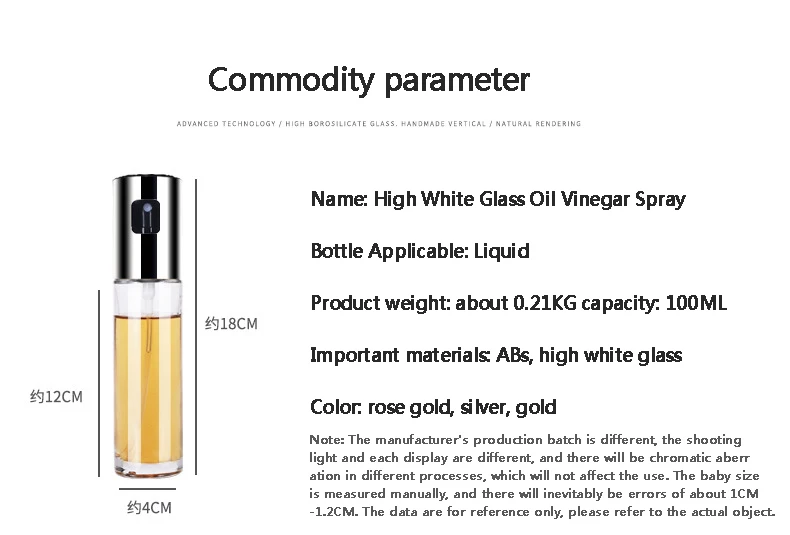 Решить ваши проблемы приготовления пищи, капель масла в масляном тумане, простой в использовании. Давление на сопло является деликатным и ровным, прост в использовании. Дизайн распылителя, контроль масла, экономия масла, поддержка кухни, здоровый образ жизни.Особенности стекла:Коррозионная стойкость, высокая стабильность, высокая стабильность материала из белого стекла, не будет разбавляться из вредных веществ, поэтому может быть помещен в соевый соус, рапсовое масло и другие жидкости. Износостойкий, легко чистится, высокая твердость белого стекла, хорошая износостойкость, не легко собирает грязь, не впитывает загрязнения, легко чистится. Светильник, защита окружающей среды, высокий вес белого стекла.Особенности продукта:1. Подходит для масла, уксуса, соевого соуса, лимонного сока или вина, при первом использовании необходимо выжать несколько уровней насоса.2. Это идеальная распылительная бутылка для замены неаэрозольных инжекторов, которые используют кисти для смазки во время выпечки, жарки, выпечки и приготовления пищи без каких-либо вредных пропеллеров или химических веществ.3. Легко чистить, Открутите крышку, просто налейте бутылку горячей водой и капелькой мягкого моющего средства и нажмите кнопку распыления масла, не перемешивая.Материал: АБС + высокое белое стеклоПараметры: диаметр 4 см в высоту 17,5 см один Емкость 100 млОсобенности: тонкая работа, тонкий дизайн; Подходит для использования на кухне.Цвет: розовое золото, Серебряное золотоПримечание:1. Реальный цвет изделия могут быть повреждены во время быть s светильник ly отличается от изображения из-за разницы в светильник и с настройками экрана.2. Пожалуйста, примите во внимание, что возможна погрешность в 0,5-2 см в связи с тем, что измерения выполнены вручную.3. Мы тщательно проверяем каждый товар перед отправкой. Гарантия качества для всех дорогих клиентов!