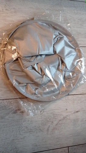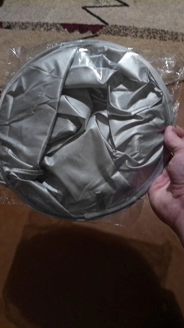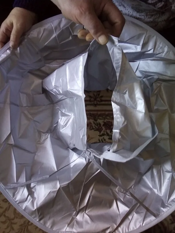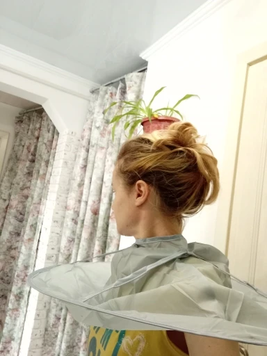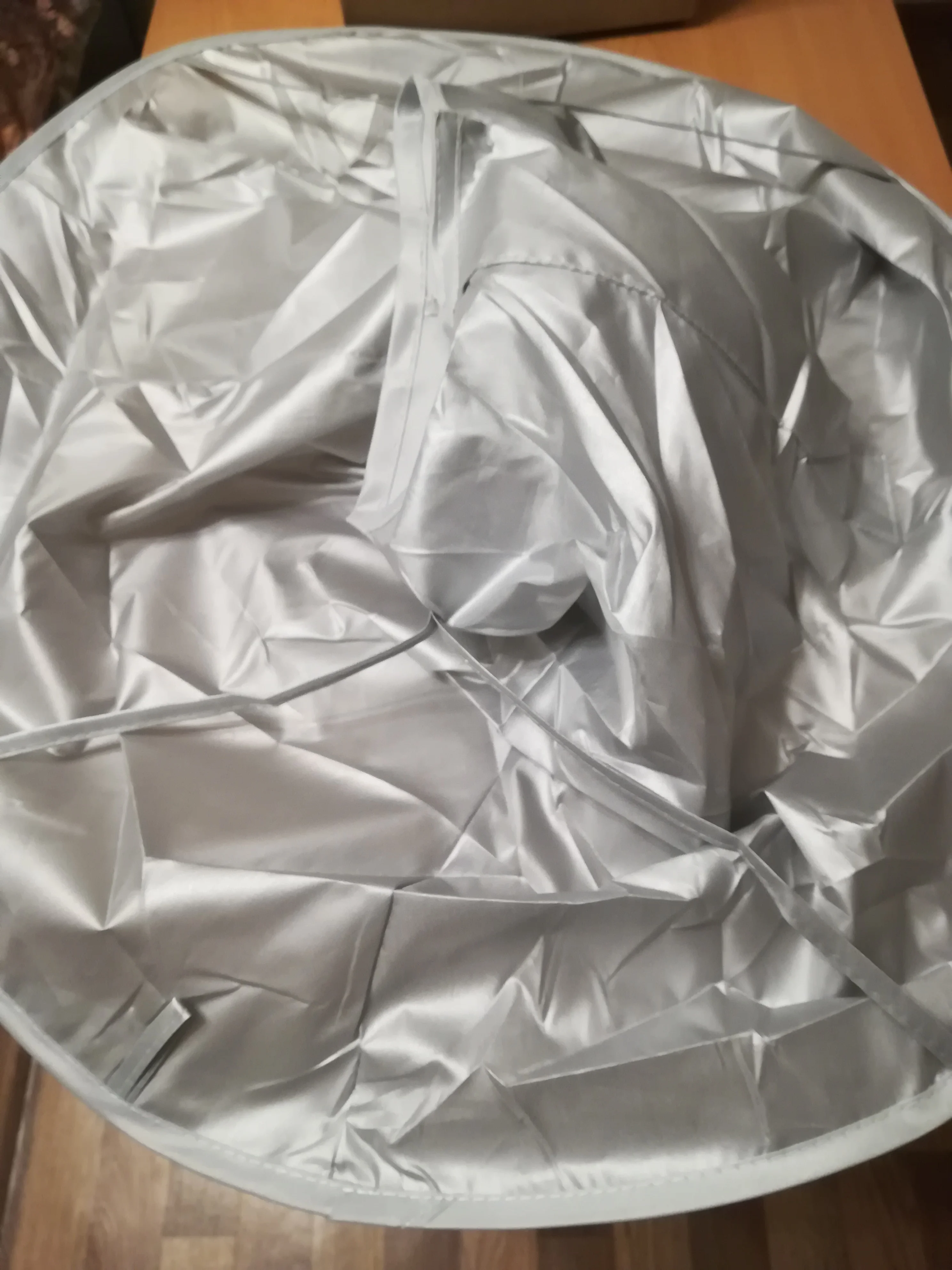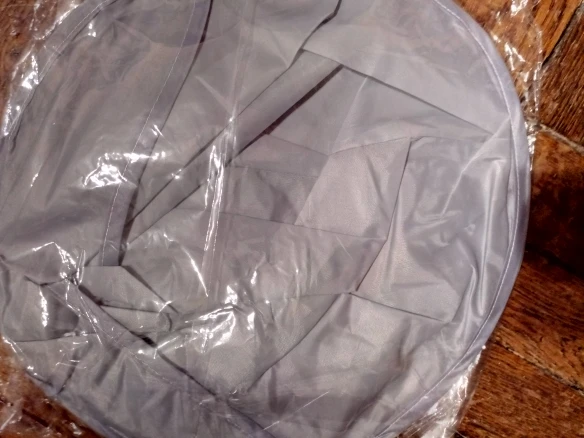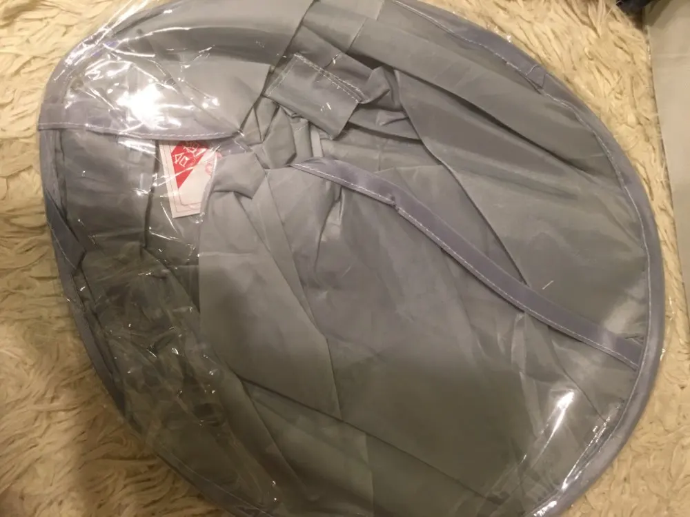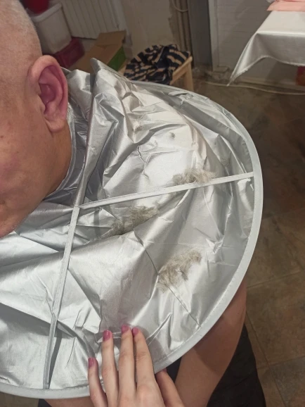 Ткань сильно мятая, а гладить её нельзя. Проволочный обод в рекламных фото был выше плеч и ближе к голове получалась канавка. В действительности её почти нет. Остриженные волосы могут вываливаться наружу из-за малой глубины. В действии пока не проверяли, только примерили.