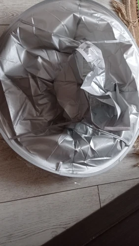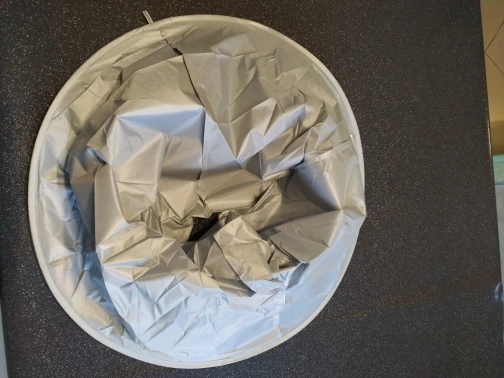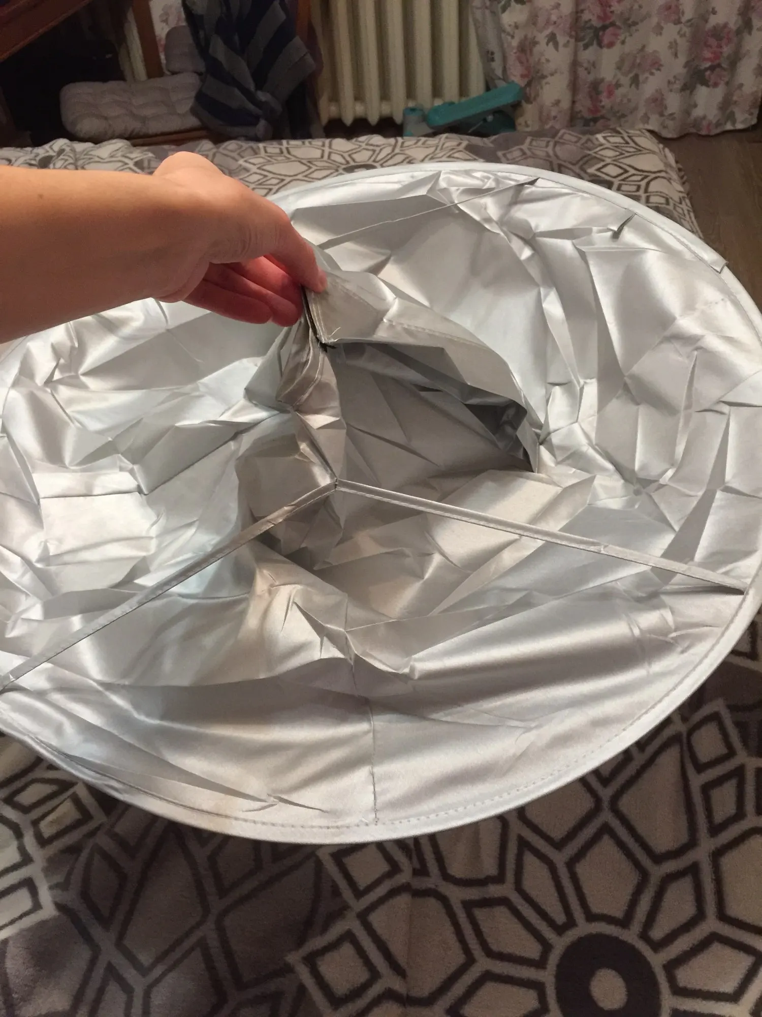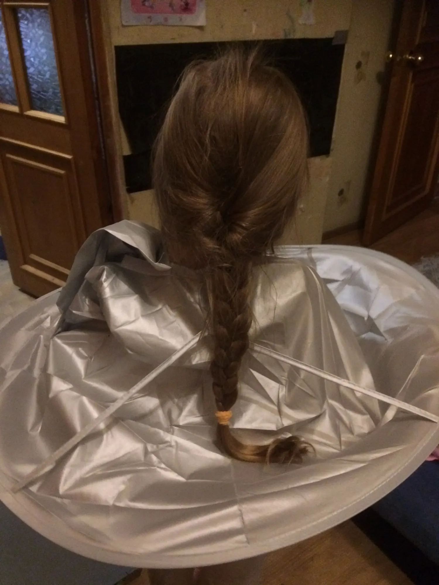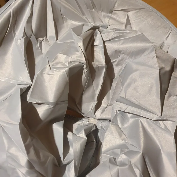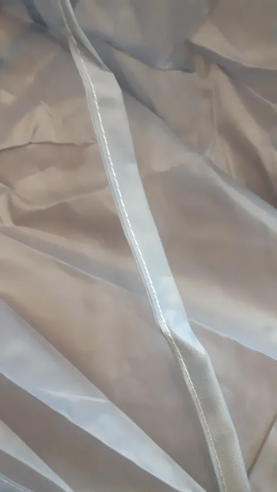 Ткань сильно мятая, а гладить её нельзя. Проволочный обод в рекламных фото был выше плеч и ближе к голове получалась канавка. В действительности её почти нет. Остриженные волосы могут вываливаться наружу из-за малой глубины. В действии пока не проверяли, только примерили.