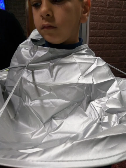 Классная накидка для стрижки. На ребёнка худенького сидит хорошо, на подростка, думаю, тоже подойдёт. Ребёнок при стрижки активно шилопопил, но волосы не разбросал