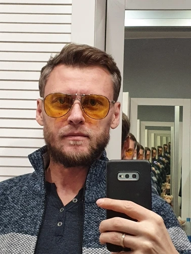 Очки отличные. Подпруженнные шарниры упоров, упоры регулируются по длине. Богатая комплектация: салфетка, тряпичный чехол, тест на поляризацию, жесткий очешник+сувенир. Посылка была отлично упакована и пришла быстро. Стекла очков пластиковые, янтарного цвета. На солнце очки становятся коричневыми. Степень затемнения невысокая, примерно 2. Неожиданным был факт того, что все поверхности отражающие солнечный свет, интенсивно подкрашиваются желтым. Стекла авто, витрины, лужи, текущие ручьи, мокрый асфальт. Очень непривычно. Пример - на фото.