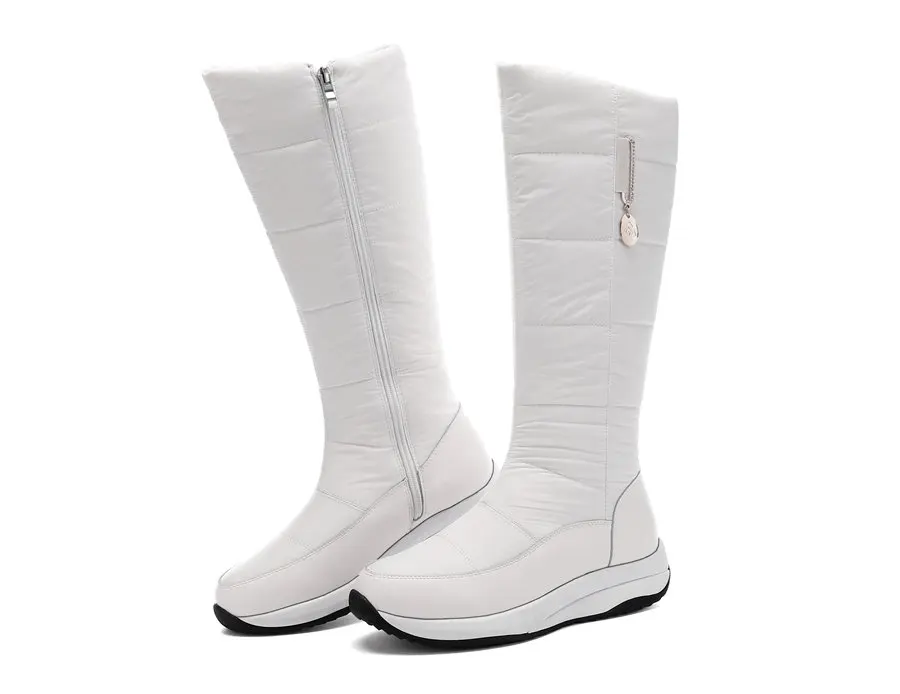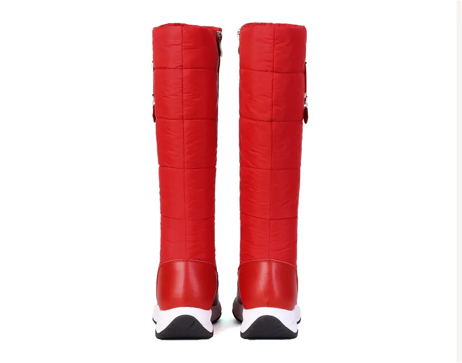Зимние женские сапоги; Водонепроницаемые повседневные женские сапоги до колена из натуральной кожи на плоской подошве и платформе; Цвет красный, белый
