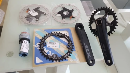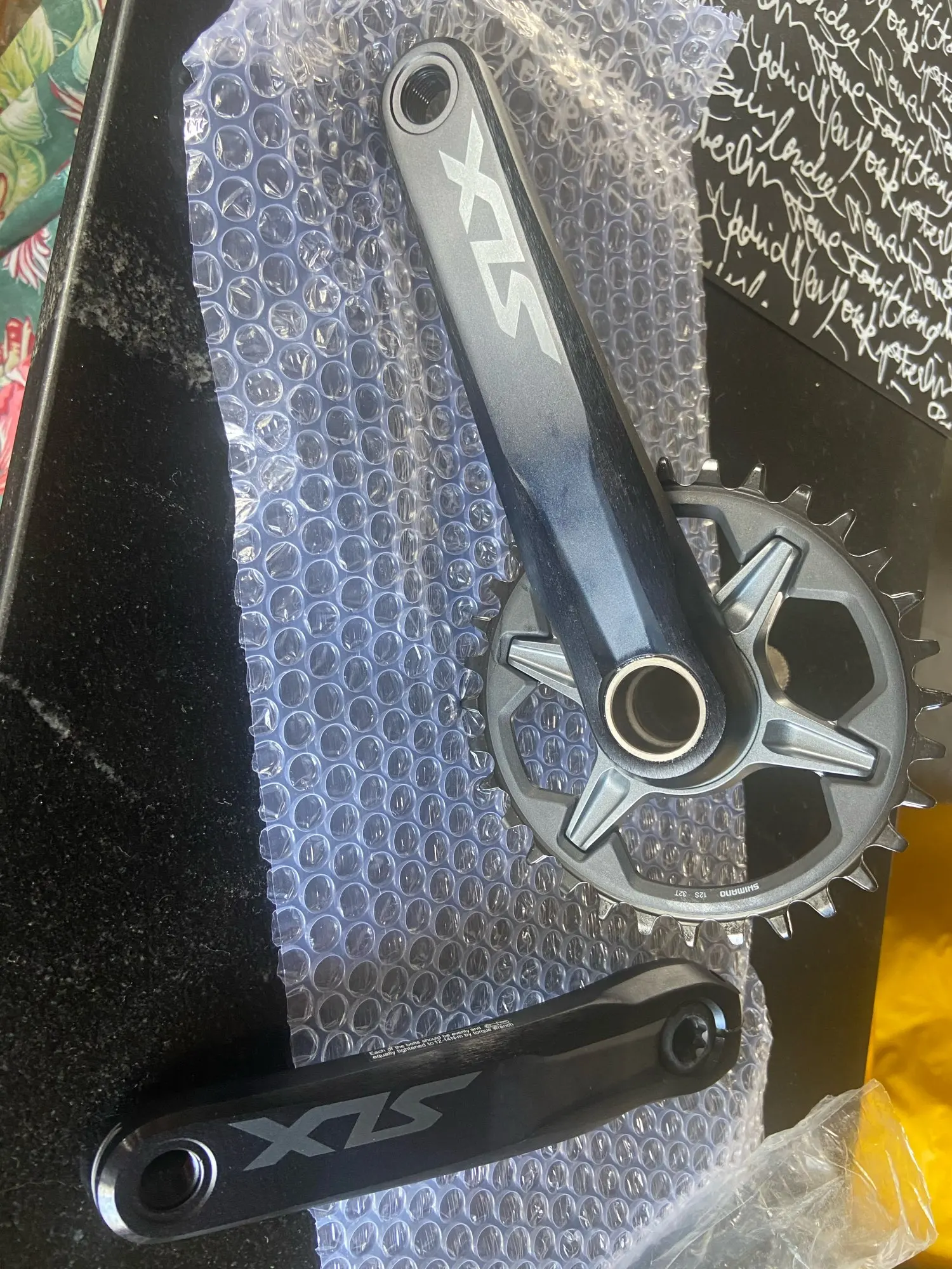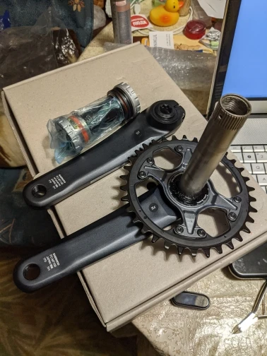 Хороший комплект оригинальных комплектующих Shimano для моего нового байка. Звезда предустановлена на шатуны, момент затяжки буду проверять позже при сборке. Каретка с дистанцирующими колечками - спасибо продавцу, что не забыл и не потерял. Комплектующие были хорошо упакованы и зафиксированы в коробке, так что никаких повреждений. Да и транспортные компании не помыли посылку. Хороший продавец с хорошими ценами, рекомендую! P. S. Если кого интересует масса, то шатуны 170мм / 34 зуба - 642г, а каретка - 93г.