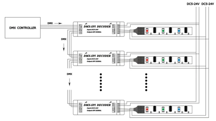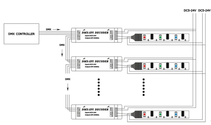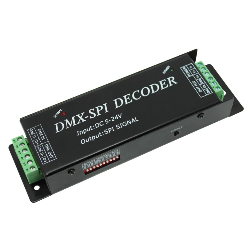Декодер DMX-SPI принимает усовершенствованный блок микроуправления, он получает Стандартный DMX-512 цифровой контрольный сигнал, который широко используется на международном уровне и преобразует его в сигнал SPI для привода светодиодный, он поддерживает 10 видов различных моделей ламп, в то же время порт сигнала DMX имеет меры защиты от молнии; Вы можете подключить декодер DMX к цифровой консоли DMX для достижения затемнения или различных изменений процедур. Не подключен к консоли DMX, вы можете выбрать встроенный 35 видов узоров по умолчанию с помощью кнопки modle, точки по умолчанию-1024.