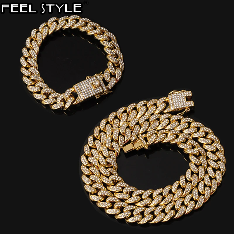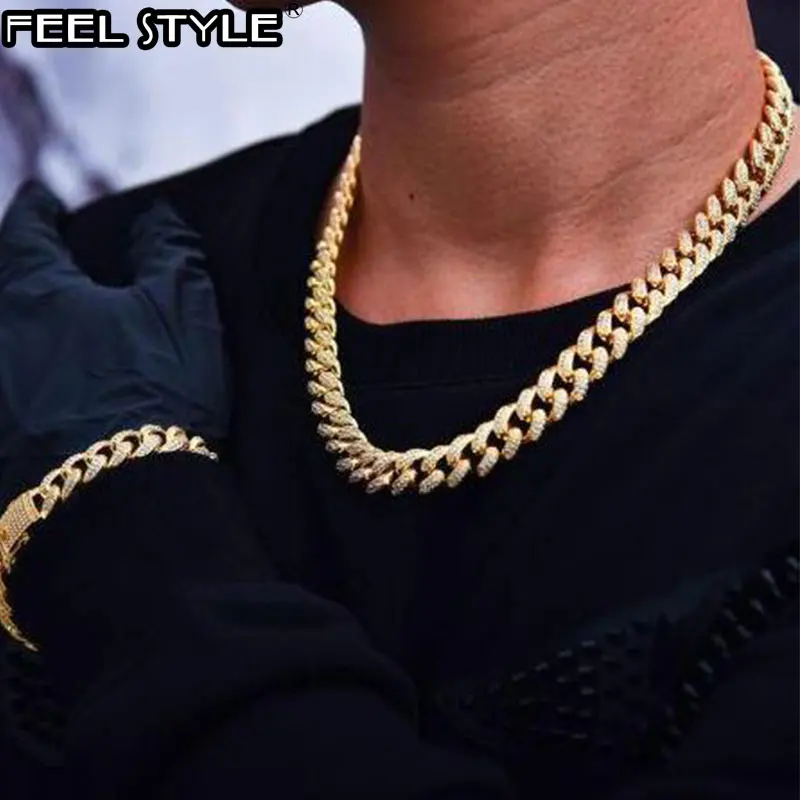 Мужские сверкающие ожерелья из кубинской панцирной цепи Майами, сверкающие ожерелья в стиле хип-хоп 13 мм с фианитами, 1 комплект