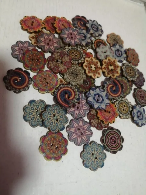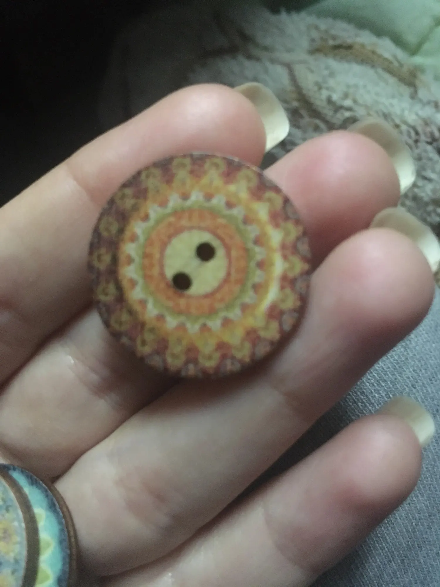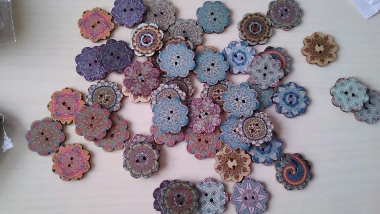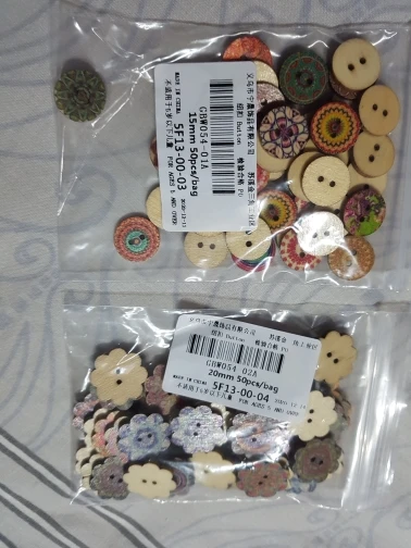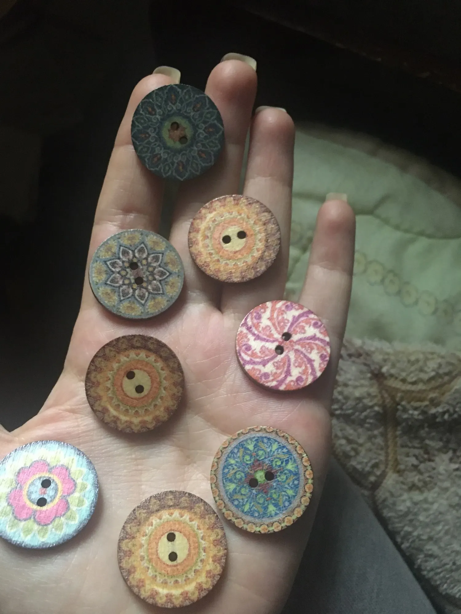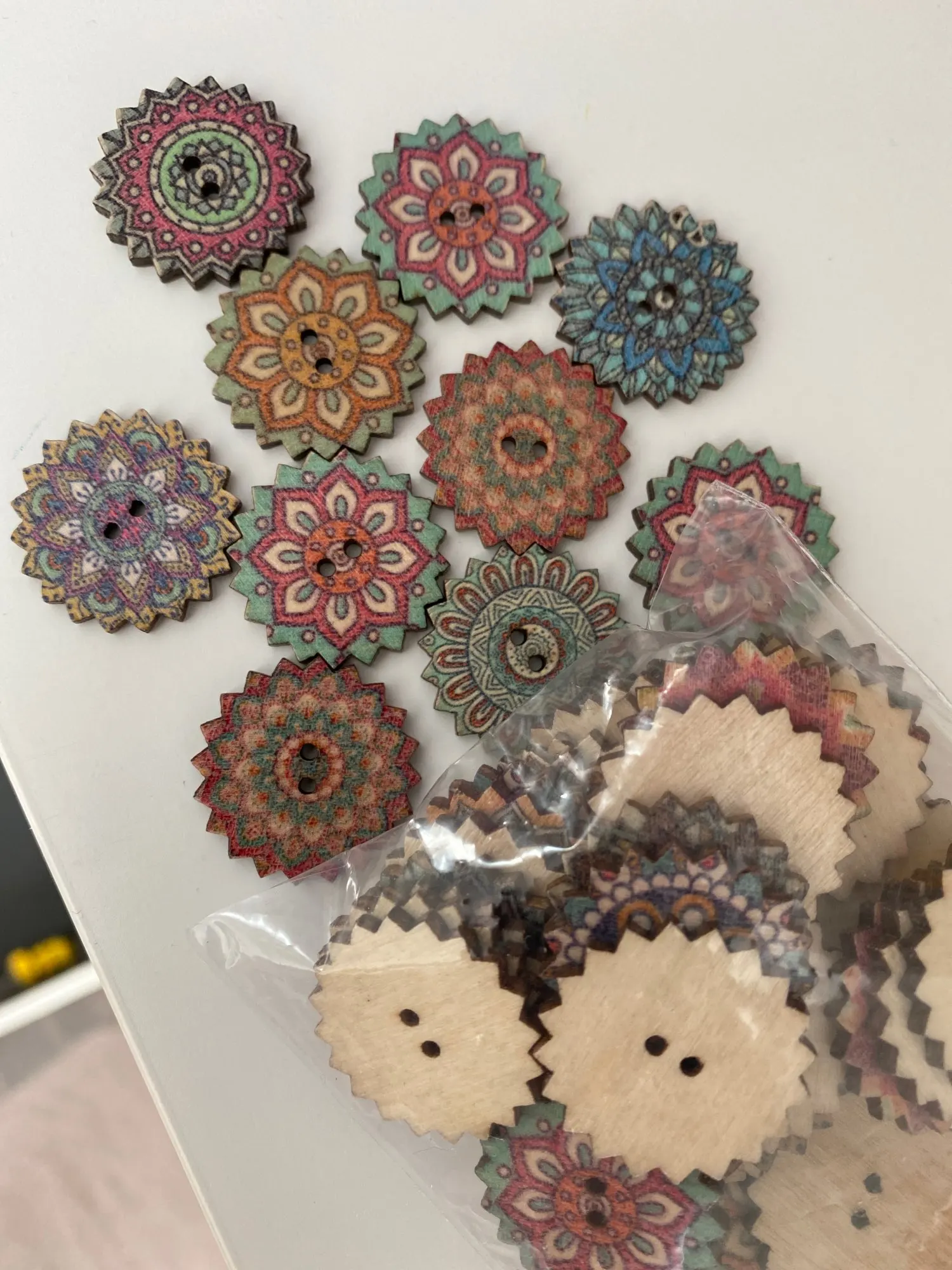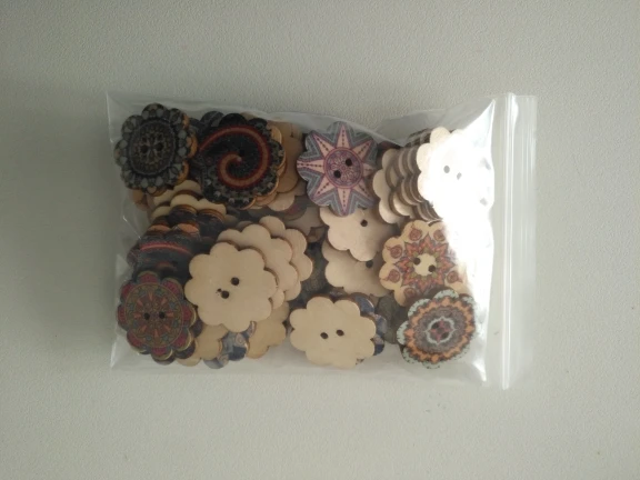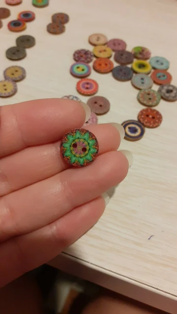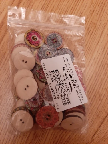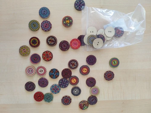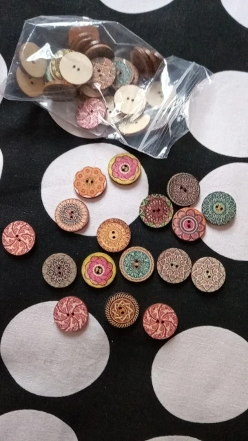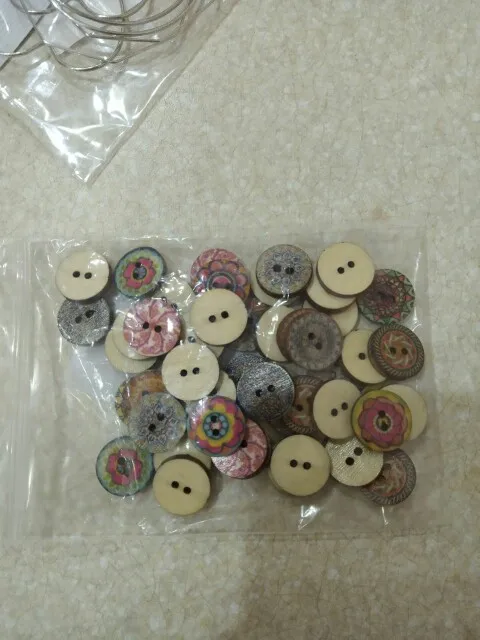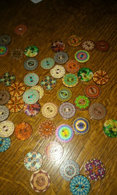 Деревянные пуговички. Неплохие. Только думала, что на них рисунок, а выглядит все это так, как будто на них цветные тонкие наклеечки. Рисунок не везде такой яркий и чёткий, как на картинке. Но мне для работы подойдут. А ещё, я сделала таких пуговок два заказа и получила сообщение, что они придут в одной посылке. Но сегодня получила только один набор. Ровно 50 штук.