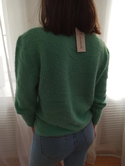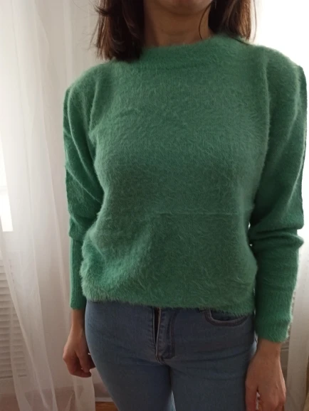 Очень быстрая доставка. Пушистый, как на фото; Симпатичный светло-зеленый цвет, не синий; Состав: 30% шерсть и остальные полиэстер. Размер соответствует европейскому размеру 38 или S/M. В целом я очень доволен