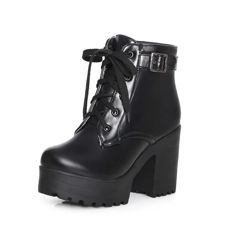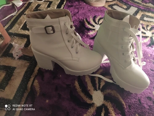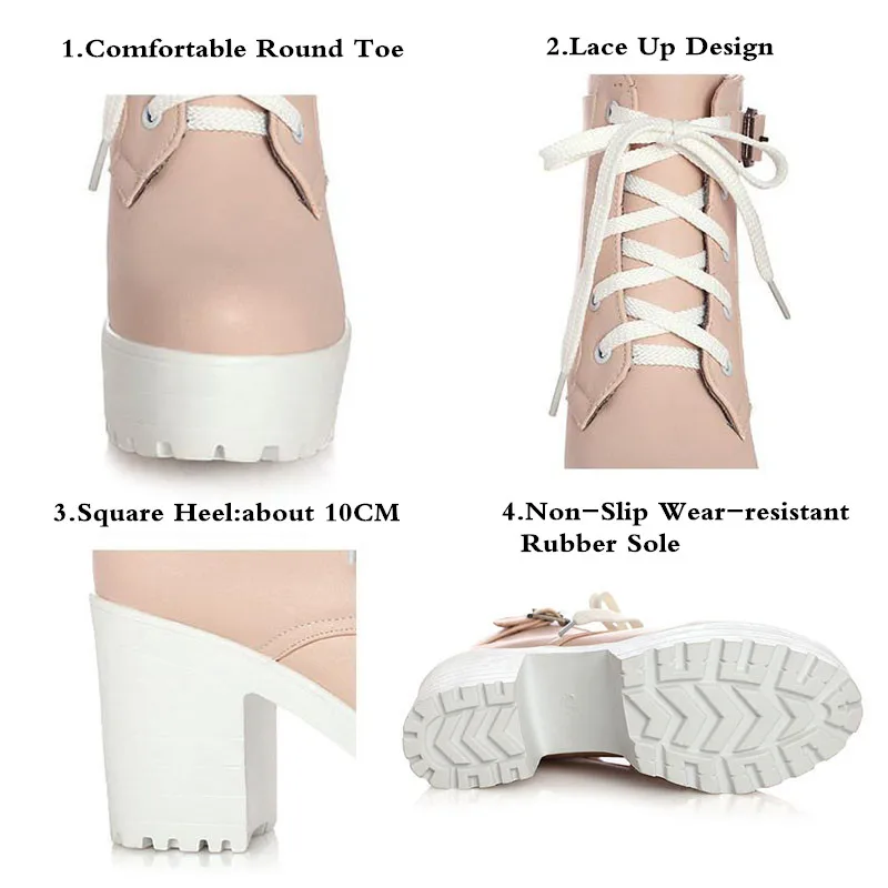 1. Удобный круглый носок2. Дизайн со шнуровкой3. Квадратный каблук: около 10 см4. Нескользящая износостойкая резиновая подошва