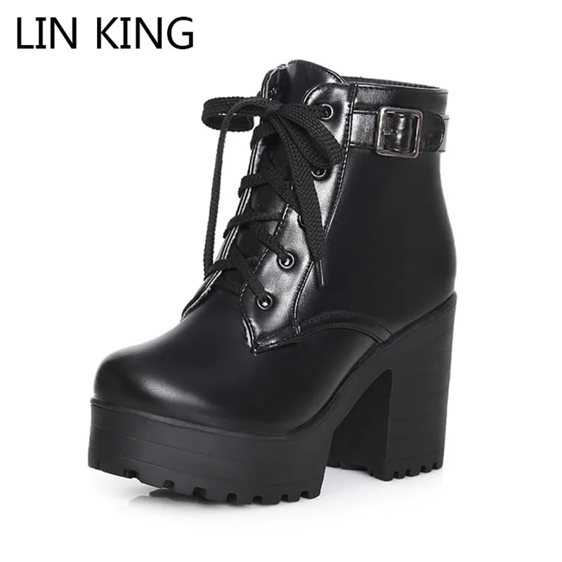 LIN KINGженские зимние полусапожки на высоком каблуке; Теплые женские ботинки на шнуровке с круглым носком; Водонепроницаемые мотоботы; Обувь большого размера