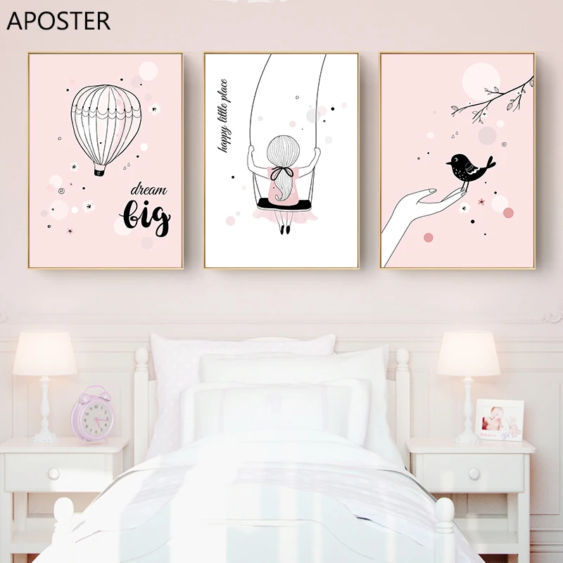 Картина в скандинавском стиле розовая девочка-качели с воздушным шаром, Картина на холсте для детской комнаты, плакаты, печатные картины на стену, декор для детской комнаты