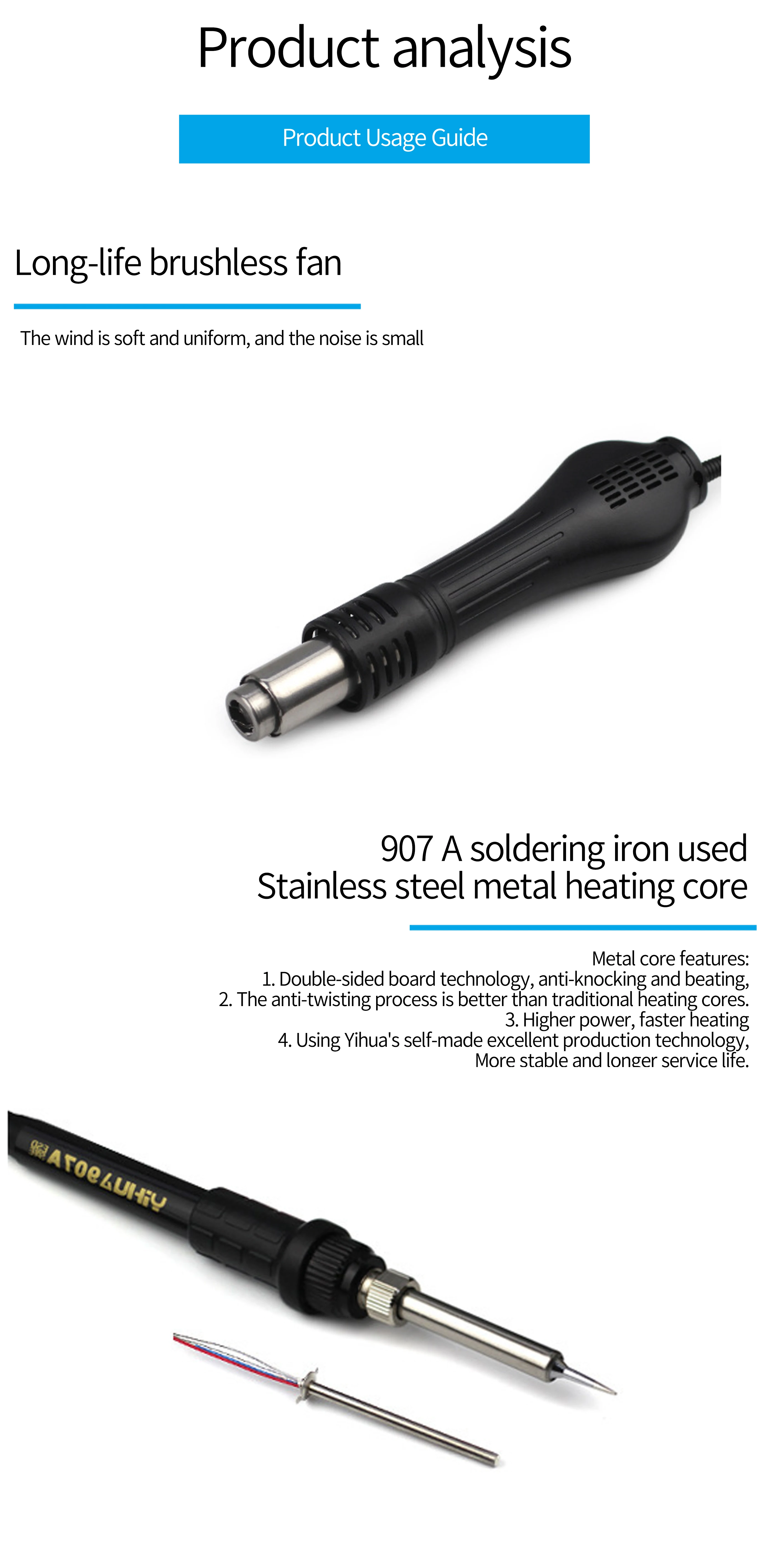 2). Паяльная станция, температура переработы горячим воздухом использует интеллектуальное нечеткое логическое ПИД-контроль, поэтому температурный устойчивый дрейф относительно мал, Он преодолевает дрейф довольно быстро даже в суровых условиях.3). Емкость вентилятора, паяльник и перезагрузка горячего воздуха регулируются, напряжение источника питания отображается на светодиодный цифровой дисплее, и он постоянно обновляется.4). Паяльник, перезагрузка горячего воздуха и источник питания постоянного тока используют независимый двухъядерный микроконтроллер, что означает, что они могут работать независимо, когда проблема возникает на одном инструменте, это не влияет на других. Двухъядерный процессор используется во избежание сбоев.5). Паяльник, паяльник оснащен разнообразной защитой от неисправностей6). Продукт прост в дизайне, поэтому он может работать без слишком большого количества клавиш.